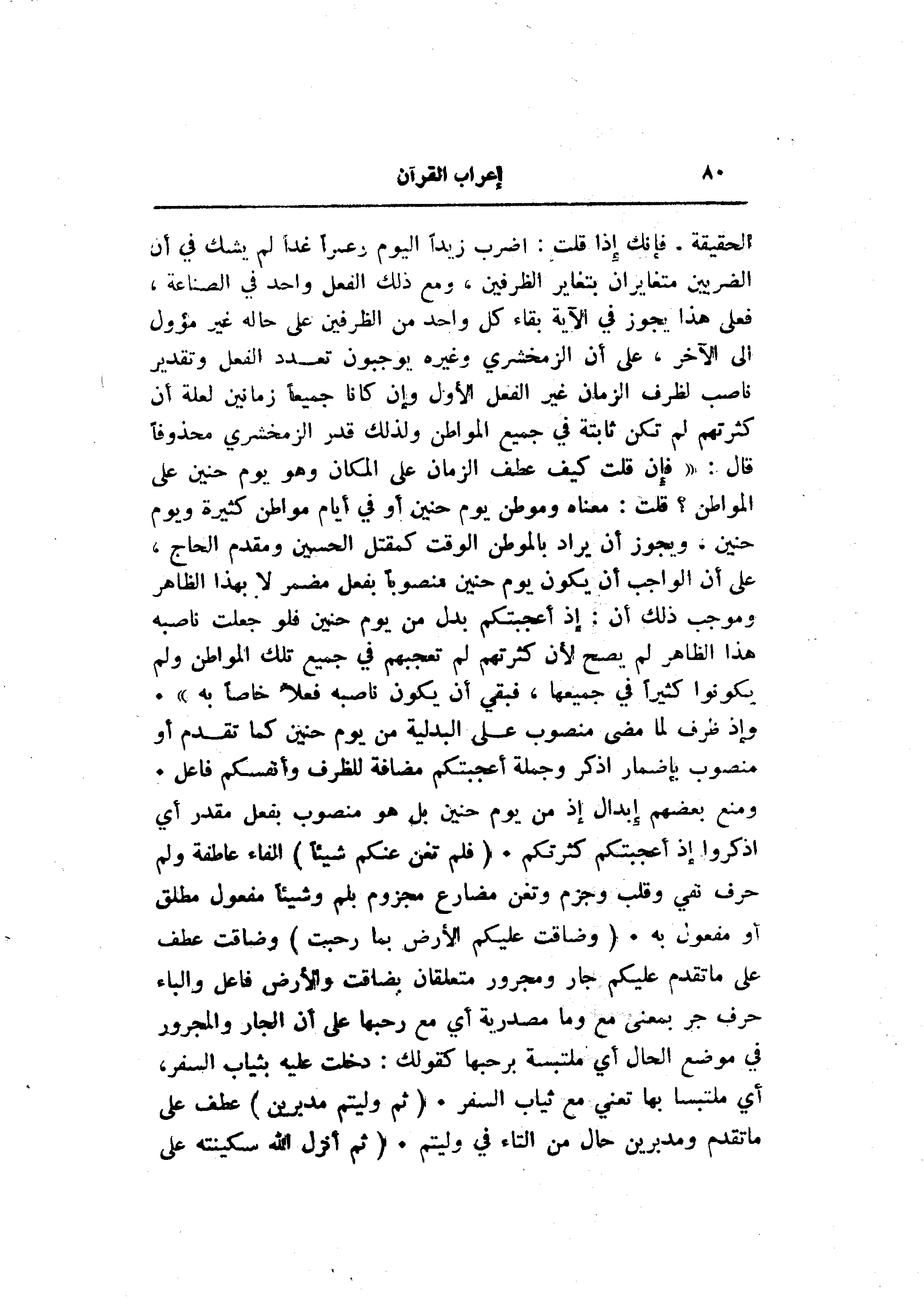 ومنع بعضهم إبدال إذ من يوم حنين بل هو منصوب بفعل مقدر أي اذكروا إذ أعجبتكم كثرتكم. (فَلَمْ تُغْنِ عَنْكُمْ شَيْئاً) الفاء عاطفة ولم حرف نفي وقلب وجزم وتغن مضارع مجزوم بلم وشيئا مفعول مطلق أو مفعول به. (وَضاقَتْ عَلَيْكُمُ الْأَرْضُ بِما رَحُبَتْ) وضاقت عطف على ما تقدم عليكم جار ومجرور متعلقان بضاقت والأرض فاعل والباء حرف جر بمعنى مع وما مصدرية أي مع رحبها على أن الجار والمجرور في موضع الحال أي ملتبسة برحبها كقولك: دخلت عليه بثياب السفر، أي ملتبسا بها تعني مع ثياب السفر. (ثُمَّ وَلَّيْتُمْ مُدْبِرِينَ) عطف على ما تقدم ومدبرين حال من التاء في وليتم. (ثُمَّ أَنْزَلَ اللَّهُ سَكِينَتَهُ عَلى رَسُولِهِ وَعَلَى الْمُؤْمِنِينَ)