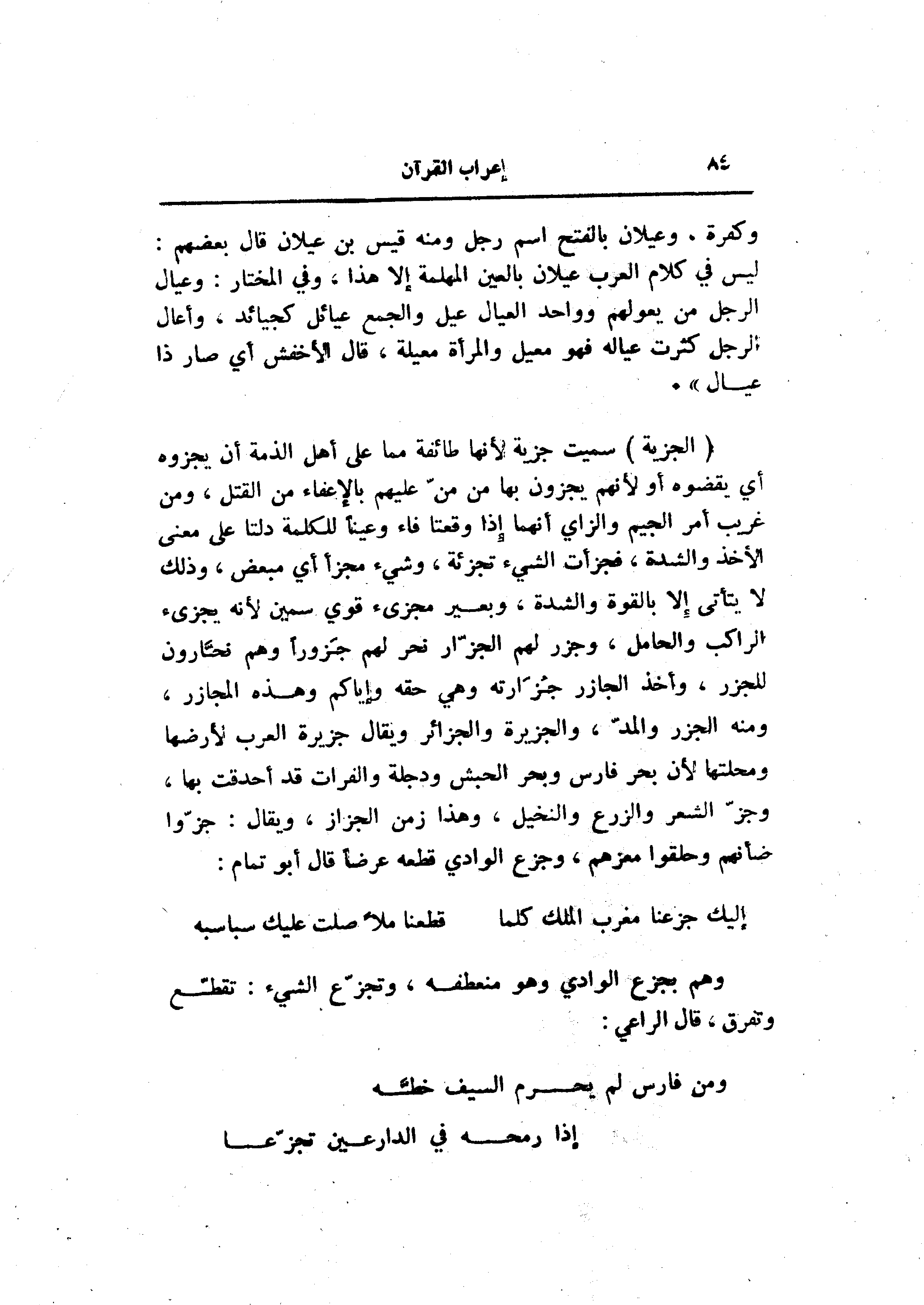(الْجِزْيَةَ) سميت جزية لأنها طائفة مما على أهل الذمة أن يجزوه أي يقضوه أو لأنهم يجزون بها من منّ عليهم بالإعفاء من القتل، ومن غريب أمر الجيم والزاي أنهما إذا وقعتا فاء وعينا للكلمة دلتا على معنى الأخذ والشدة، فجزأت الشيء تجزئة، وشيء مجزأ أي مبعض، وذلك لا يتأتى إلا بالقوة والشدة، وبعير مجزىء قوي سمين لأنه يجزىء الراكب والحامل، وجزر لهم الجزّار نحر لهم جزورا وهم نحّارون للجزر، وأخذ الجازر جزارته وهي حقه وإياكم وهذه المجازر، ومنه الجزر والمدّ، والجزيرة والجزائر ويقال جزيرة العرب لأرضها ومحلتها لأن بحر فارس وبحر الحبش ودجلة والفرات قد أحدقت بها، وجزّ الشعر والزرع والنخيل، وهذا زمن الجزاز، ويقال: جزّوا ضأنهم وحلقوا معزهم، وجزع الوادي قطعة عرضا قال أبو تمام: