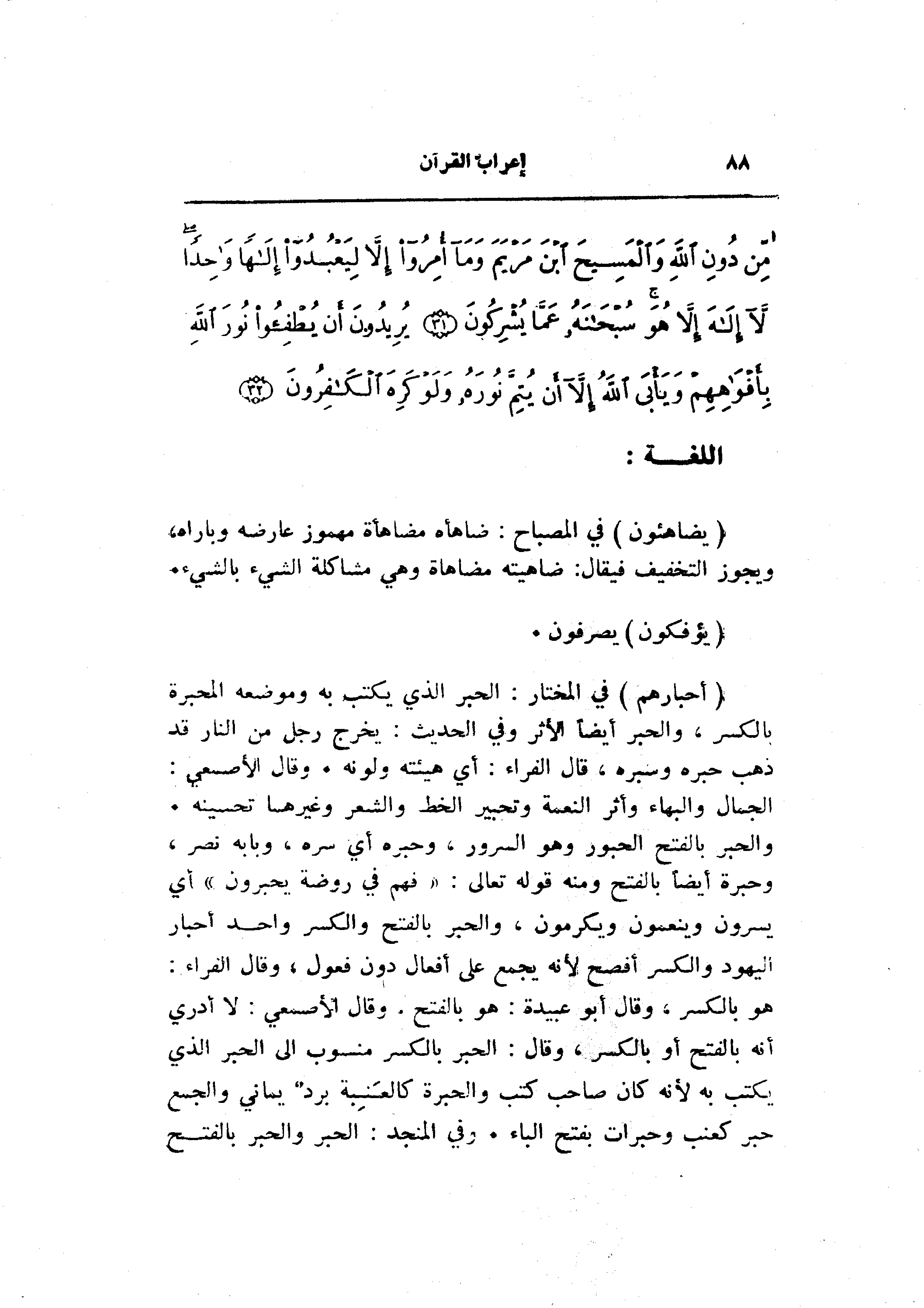 (أَحْبارَهُمْ) في المختار: الحبر الذي يكتب به وموضعه المحبرة بالكسر، والحبر أيضا الأثر وفي الحديث: يخرج رجل من النار قد ذهب حبره وسبره، قال الفراء: أي هيئته ولونه. وقال الأصمعي:
