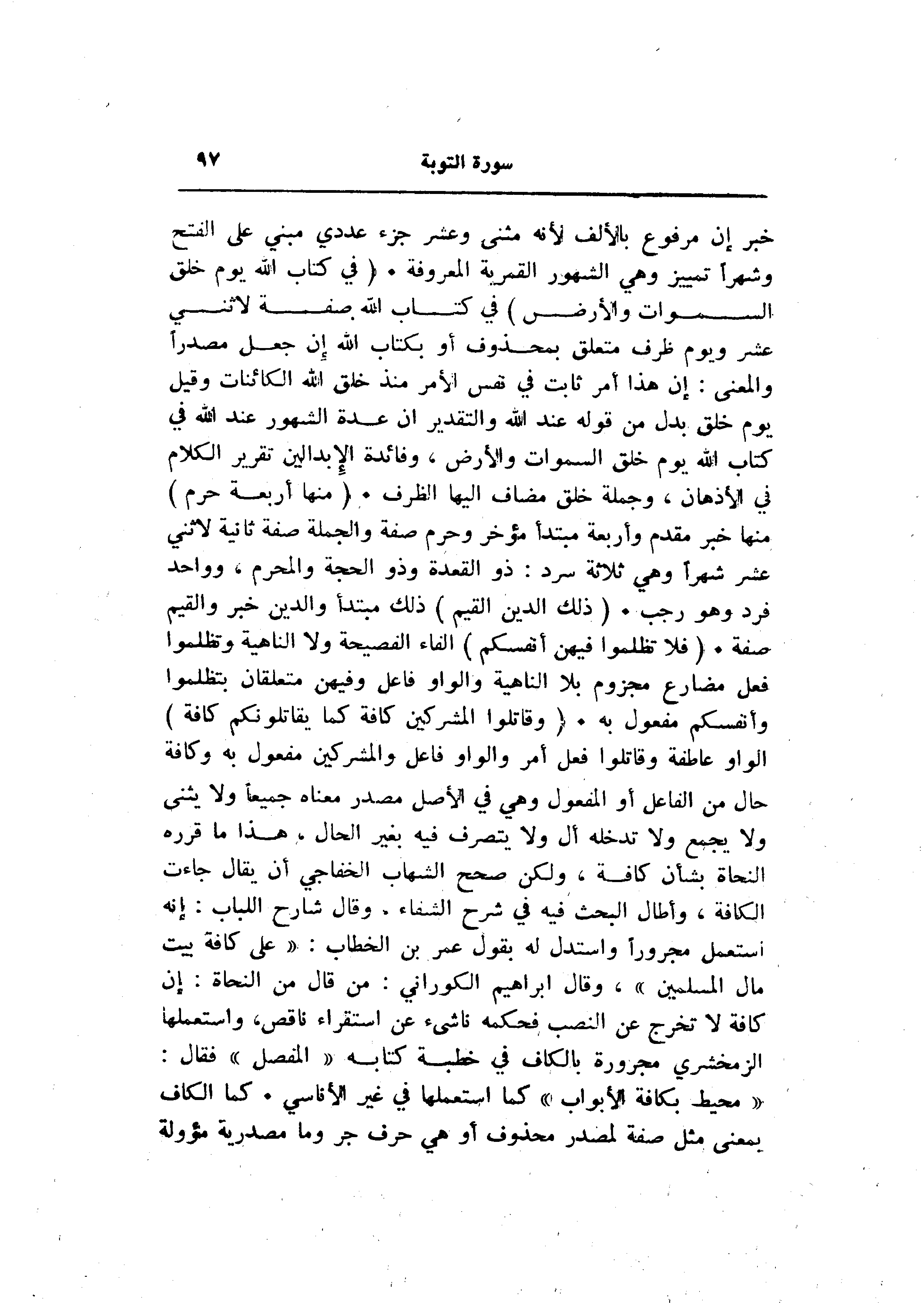 خبر إن مرفوع بالألف لأنه مثنى وعشر جزء عددي مبني على الفتح وشهرا تمييز وهي الشهور القمرية المعروفة. (فِي كِتابِ اللَّهِ يَوْمَ خَلَقَ السَّماواتِ وَالْأَرْضَ) في كتاب الله صفة لاثني عشر ويوم ظرف متعلق بمحذوف أو بكتاب الله إن جعل مصدرا والمعنى: إن هذا أمر ثابت في نفس الأمر منذ خلق الله الكائنات وقيل يوم خلق بدل من قوله عند الله والتقدير ان عدة الشهور عند الله في كتاب الله يوم خلق السموات والأرض، وفائدة الإبدالين تقرير الكلام في الأذهان، وجملة خلق مضاف إليها الظرف. (مِنْها أَرْبَعَةٌ حُرُمٌ) منها خبر مقدم وأربعة مبتدأ مؤخر وحرم صفة والجملة صفة ثانية لاثني عشر شهرا وهي ثلاثة سرد: ذو القعدة وذو الحجة والمحرم، وواحد فرد وهو رجب. (ذلِكَ الدِّينُ الْقَيِّمُ) ذلك مبتدأ والدين خبر والقيم صفة. (فَلا تَظْلِمُوا فِيهِنَّ أَنْفُسَكُمْ) الفاء الفصيحة ولا الناهية وتظلموا فعل مضارع مجزوم بلا الناهية والواو فاعل وفيهن متعلقان بتظلموا وأنفسكم مفعول به. (وَقاتِلُوا الْمُشْرِكِينَ كَافَّةً كَما يُقاتِلُونَكُمْ كَافَّةً) الواو عاطفة وقاتلوا فعل أمر والواو فاعل والمشركين مفعول به وكافة حال من الفاعل أو المفعول وهي في الأصل مصدر معناه جميعا ولا يثنى ولا يجمع ولا تدخله أل ولا يتصرف فيه بغير الحال، هذا ما قرره النحاة بشأن كافة، ولكن صحح الشهاب الخفاجي أن يقال جاءت الكافة، وأطال البحث فيه في شرح الشفاء، وقال شارح اللباب: إنه استعمل مجرورا واستدل له بقول عمر بن الخطاب: «على كافة بيت مال المسلمين» ، وقال ابراهيم الكوراني: من قال من النحاة: إن كافة لا تخرج عن النصب فحكمه ناشىء عن استقراء ناقص، واستعملها الزمخشري مجرورة بالكاف في خطبة كتابه «المفصل» فقال: