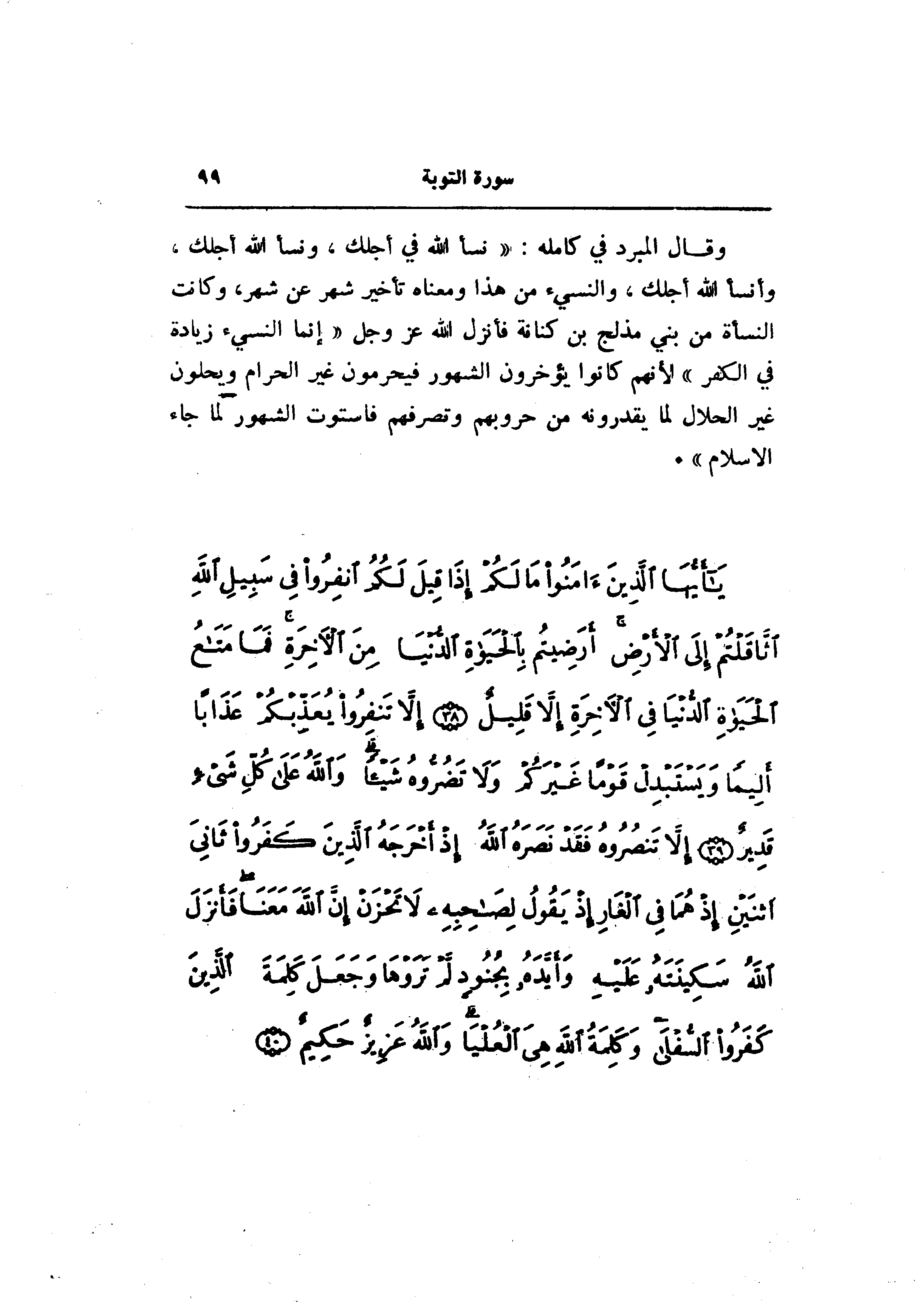 وقال المبرد في كامله: «نسأ الله في أجلك، ونسأ الله أجلك، وأنسأ الله أجلك، والنسيء من هذا ومعناه تأخير شهر عن شهر، وكانت النسأة من بني مذلج بن كنانة فأنزل الله عز وجل «إنما النسيء زيادة في الكفر» لأنهم كانوا يؤخرون الشهور فيحرمون غير الحرام ويحلون غير الحلال لما يقدرونه من حروبهم وتصرفهم فاستوت الشهور لما جاء الإسلام» .
