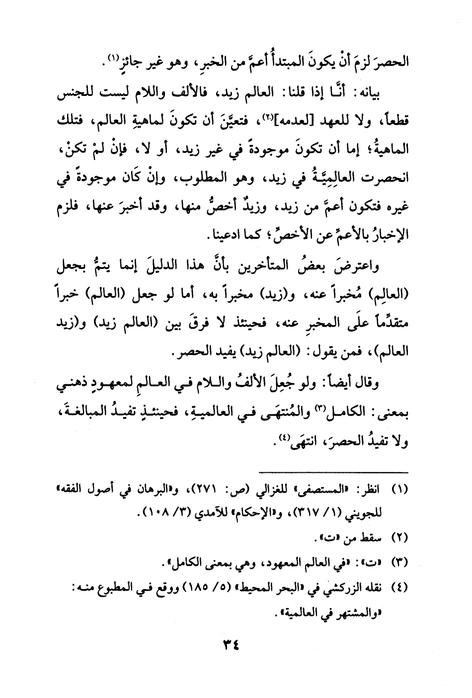 واعترضَ بعضُ المتأخرين بأنَّ هذا الدليلَ إنما يتمُّ بجعل (العالِم) مُخبرًا عنه، و (زيد) مخبرًا به، أما لو جعل (العالم) خبرًا متقدِّمًا علَى المخبرِ عنه، فحينئذ لا فرقَ بين (العالم زيد) و (زيد العالم)، فمن يقول: (العالم زيد) يفيد الحصر.