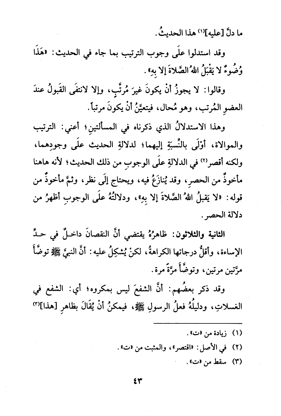 وهذا الاستدلالُ الذي ذكرناه في المسألتينِ؛ أعني: الترتيب والموالاة، أوْلَى بالنِّسبَةِ إليهما؛ لدلالةِ الحديث علَى وجودِهما، ولكنه أقصر (¬2) في الدلالةِ علَى الوجوبِ من ذلك الحديث؛ لأنه هاهنا مأخوذٌ من الحصرِ، وقد يُنازَعُ فيه، ويحتاج إلَى نظر، وثمَّ مأخوذٌ من قوله: "لا يَقبلُ اللهُ الصَّلاةَ إلا بِهِ"، ودلالتُهُ علَى الوجوبِ أظهرُ من دلالة الحصر.