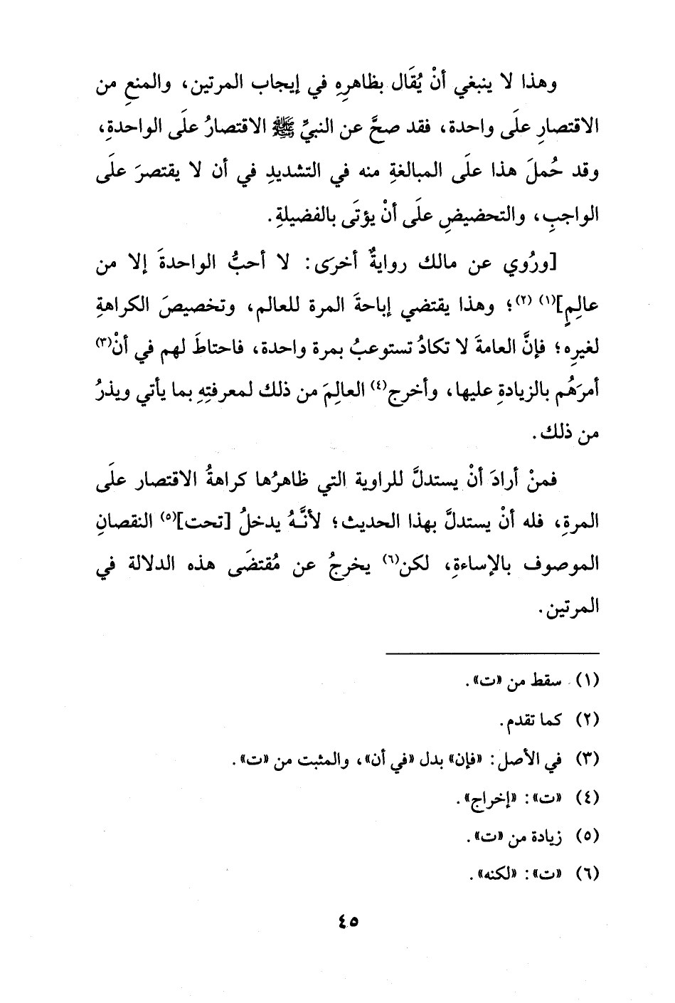 وهذا لا ينبغي أنْ يُقَال بظاهرِهِ في إيجاب المرتين، والمنعِ من الاقتصارِ علَى واحدة، فقد صحَّ عن النبيِّ - صلى الله عليه وسلم - الاقتصارُ علَى الواحدةِ، وقد حُملَ هذا علَى المبالغةِ منه في التشديدِ في أن لا يقتصرَ علَى الواجبِ، والتحضيضِ علَى أنْ يؤتَى بالفضيلةِ.