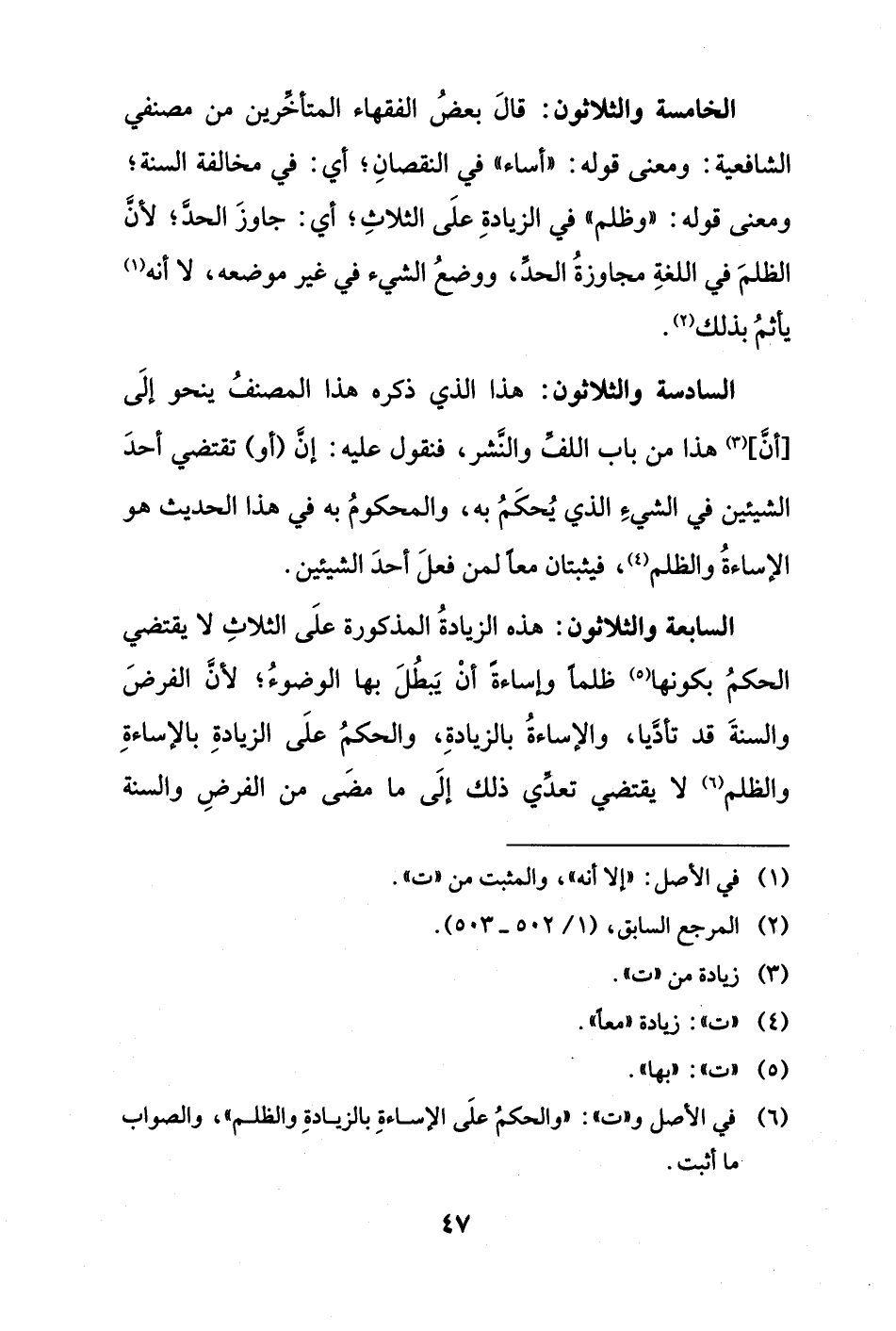الخامسة والثلاثون: قالَ بعضُ الفقهاء المتأخِّرين من مصنفي الشافعية: ومعنى قوله: "أساء" في النقصانِ؛ أي: في مخالفة السنة؛ ومعنى قوله: "وظلم" في الزيادةِ علَى الثلاثِ؛ أي: جاوزَ الحدَّ؛ لأنَّ الظلمَ في اللغةِ مجاوزةُ الحدِّ، ووضعُ الشيء في غير موضعه، لا أنه (¬1) يأثمُ بذلك (¬2).