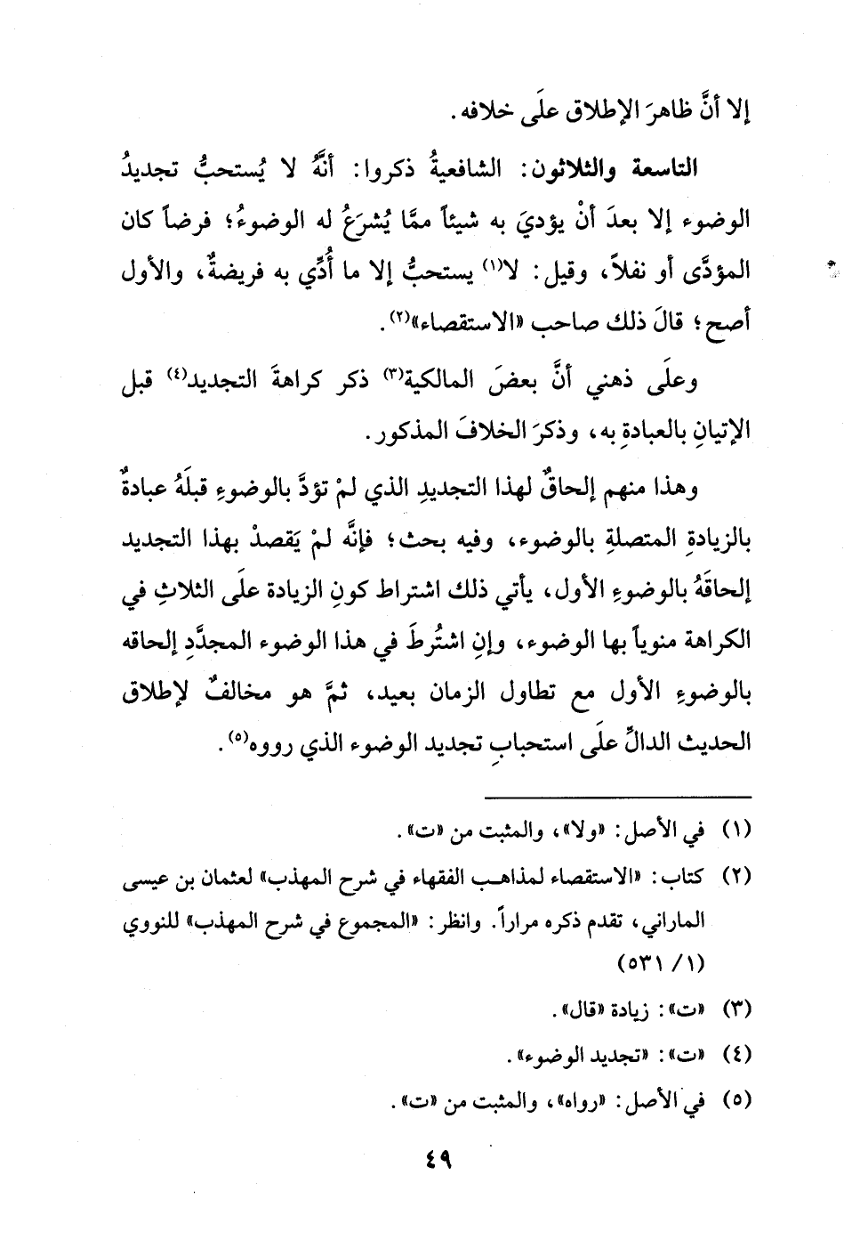 التاسعة والثلاثون: الشافعيةُ ذكروا: أنَّهُ لا يُستحبُّ تجديدُ الوضوء إلا بعدَ أنْ يؤديَ به شيئًا ممَّا يُشرَعُ له الوضوءُ؛ فرضًا كان المؤدَّى أو نفلًا، وقيل: لا (¬1) يستحبُّ إلا ما أُدِّي به فريضةٌ، والأول أصح؛ قالَ ذلك صاحب "الاستقصاء" (¬2).