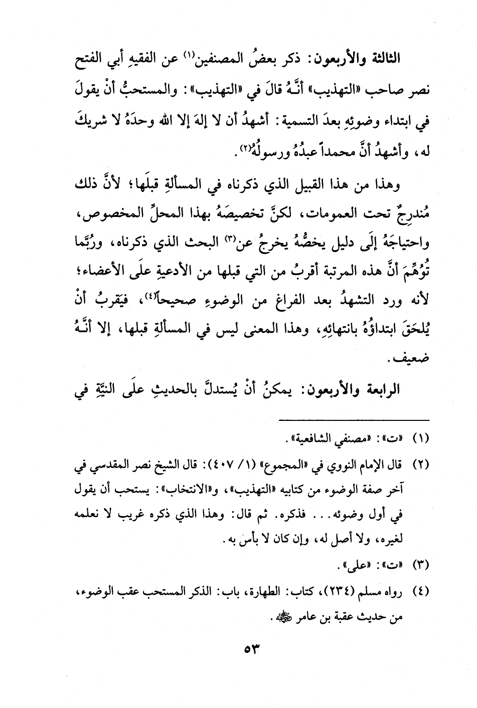 الثالثة والأربعون: ذكر بعضُ المصنفين (¬1) عن الفقيهِ أبي الفتح نصر صاحب "التهذيب" أنَّهُ قالَ في "التهذيب": والمستحبُّ أنْ يقولَ في ابتداء وضوئِهِ بعدَ التسمية: أشهدُ أن لا إلهَ إلا الله وحدَهُ لا شريكَ له، وأشهدُ أنَّ محمدًا عبدُهُ ورسولُهُ (¬2).