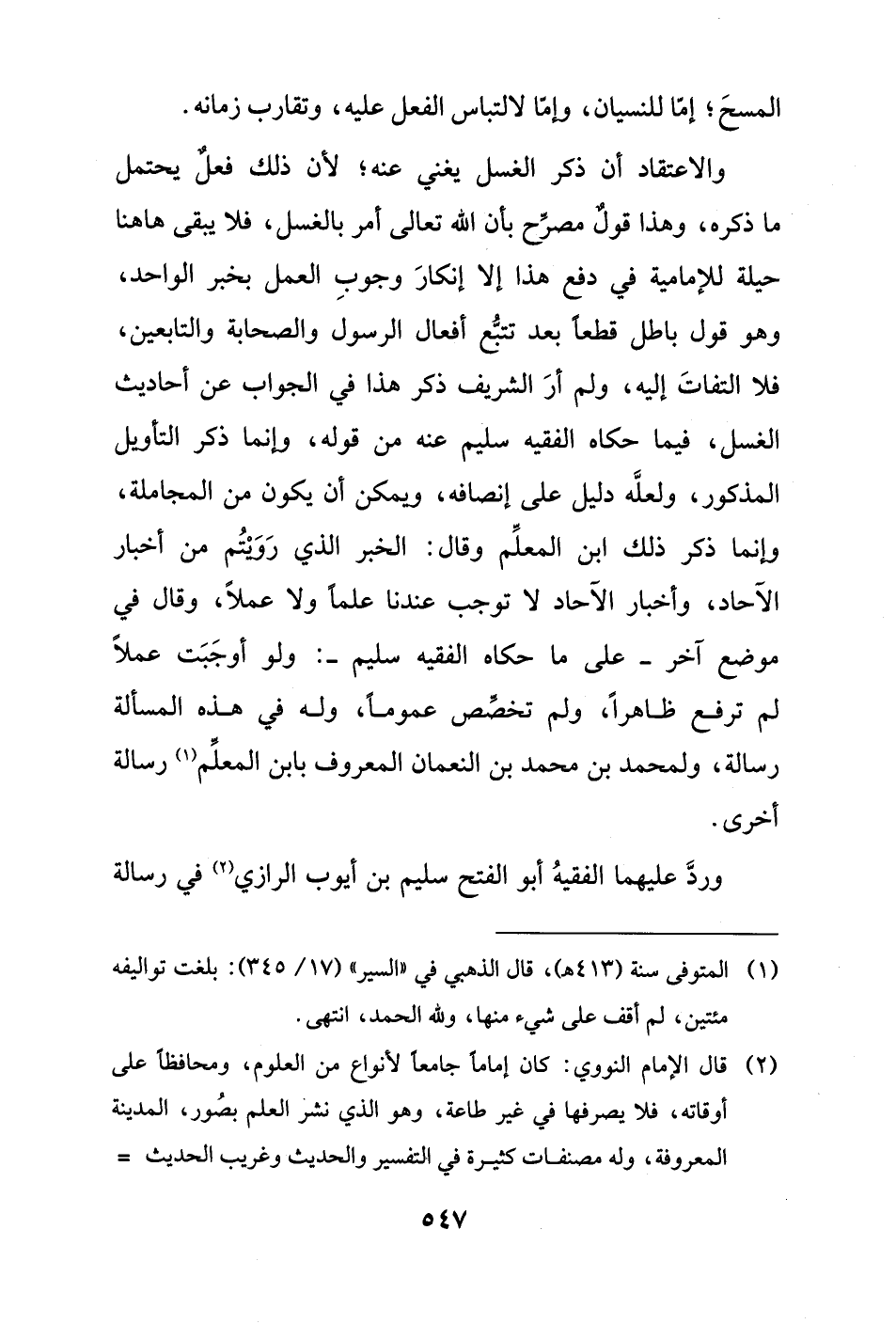 والاعتقاد أن ذكر الغسل يغني عنه؛ لأن ذلك فعلٌ يحتمل ما ذكره، وهذا قولٌ مصرِّح بأن الله تعالى أمر بالغسل، فلا يبقى ها هنا حيلة للإمامية في دفع هذا إلَّا إنكارَ وجوبِ العمل بخبر الواحد، وهو قول باطل قطعًا بعد تتبّع أفعال الرسول والصحابة والتابعين، فلا التفاتَ إليه، ولم أرَ الشريف ذكر هذا في الجواب عن أحاديث الغسل، فيما حكاه الفقيه سليم عنه من قوله، وإنما ذكر التأويل المذكور، ولعلَّه دليل على إنصافه، ويمكن أن يكون من المجاملة، وإنما ذكر ذلك ابن المعلِّم وقال: الخبر الذي رَويتُم من أخبار الآحاد، وأخبار الآحاد لا توجب عندنا علمًا ولا عملًا، وقال في موضع آخر - على ما حكاه الفقيه سليم -: ولو أوجَبَت عملًا لم ترفع ظاهرًا، ولم تخصِّص عمومًا، وله في هذه المسألة رسالة، ولمحمد بن محمَّد بن النُّعمان المعروف بابن المعلِّم (¬1) رسالة أخرى.