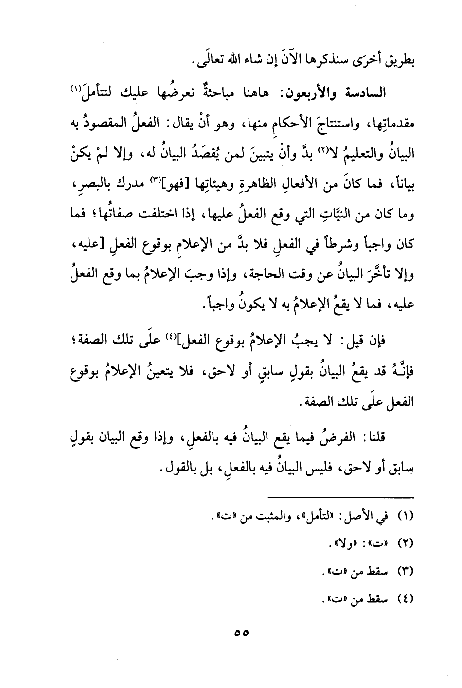 السادسة والأربعون: هاهنا مباحثةٌ نعرضُها عليك لتتأملَ (¬1) مقدماتِها، واستنتاجَ الأحكامِ منها، وهو أنْ يقال: الفعلُ المقصودُ به البيانُ والتعليمُ لا (¬2) بدَّ وأنْ يتبينَ لمن يُقصَدُ البيانُ له، وإلا لَمْ يكنْ بيانًا، فما كانَ من الأفعالِ الظاهرةِ وهيئاتِها [فهو] (¬3) مدرك بالبصرِ، وما كان من النيَّاتِ التي وقع الفعلُ عليها، إذا اختلفت صفاتُها؛ فما كان واجبًا وشرطًا في الفعلِ فلا بدَّ من الإعلامِ بوقوع الفعلِ [عليه، وإلا تأخَّرَ البيانُ عن وقت الحاجة، وإذا وجبَ الأعلامُ بما وقع الفعلُ عليه، فما لا يقعُ الإعلامُ به لا يكونُ واجبًا.