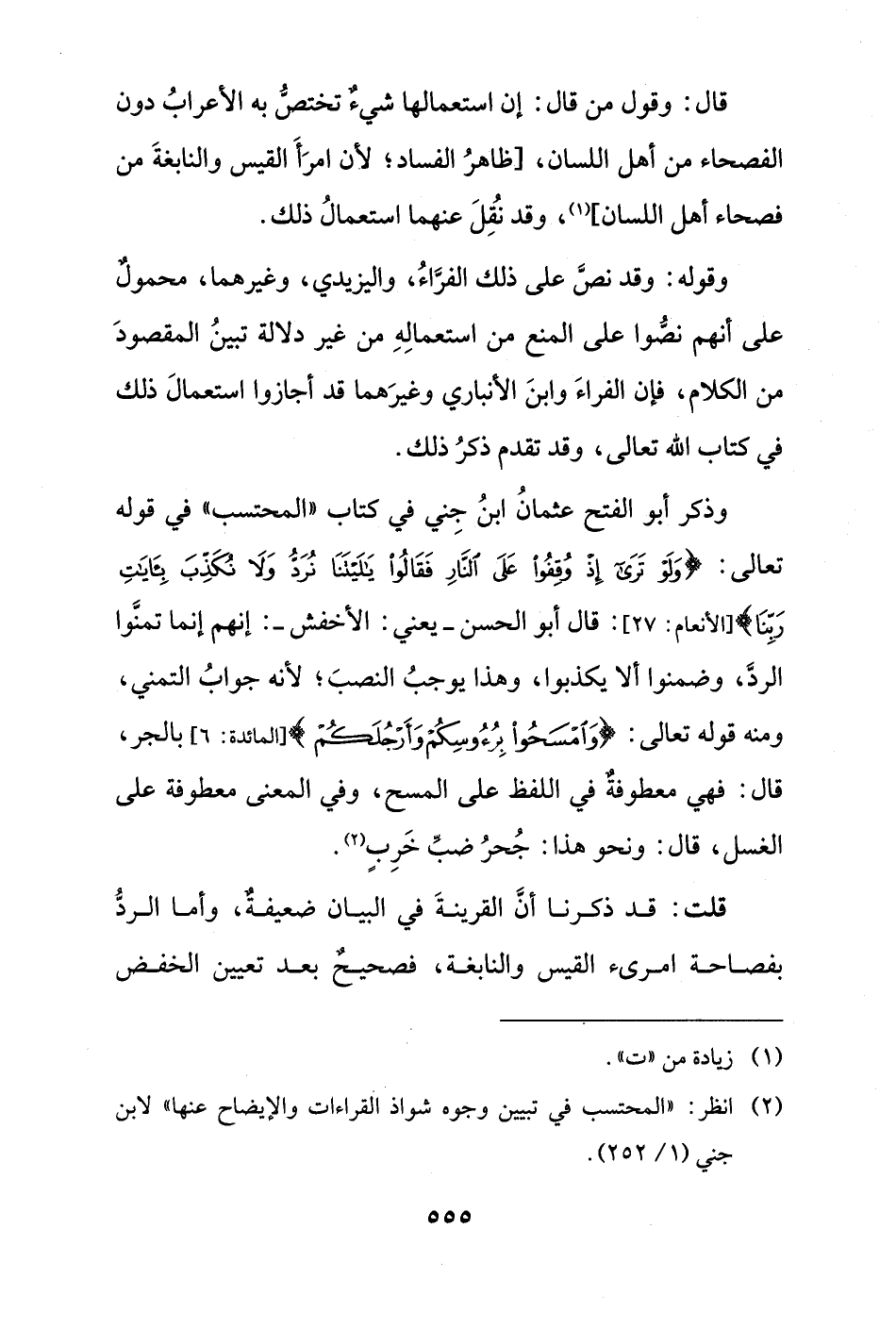 قال: وقول من قال: إن استعمالها شيءٌ تختصُّ به الأعرابُ دون الفصحاء من أهل اللسان، [ظاهرُ الفساد؛ لإن امرَأَ القيس والنابغةَ من فصحاء أهل اللسان] (¬1)، وقد نُقِلَ عنهما استعمالُ ذلك.