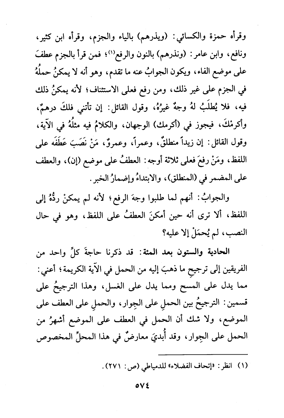 وقرأه حمزة والكسائي: (ويذرهم) بالياء والجزم، وقرأه ابن كثير، ونافع، وابن عامر: (ونذرهم) بالنون والرفع (¬1)؛ فمن قرأ بالجزم عطفَ على موضع الفاء، ويكون الجوابُ عنه ما تقدم، وهو أنه لا يمكنُ حملُهُ في الجزم على غير ذلك، ومن رفع فعلى الاستئناف؛ لأنه يمكنُ ذلك فيه، فلا يُطلَبُ لهُ وجهٌ غيرُهُ، وقول القائل: إن تأتني فلكَ درهمٌ، وأكرمْكَ، فيجوز في (أكرمك) الوجهان، والكلامُ فيه مثلُهُ في الآية، وقول القائل: إن زيدًا منطلقٌ، وعمراً، وعمروٌ، مَنْ نصبَ عَطَفَه على اللفظ، ومَنْ رفعَ فعلى ثلاثة أوجه: العطفُ على موضع (إن)، والعطف على المضمر في (المنطلق)، والابتداءُ وإضمارُ الخبر.