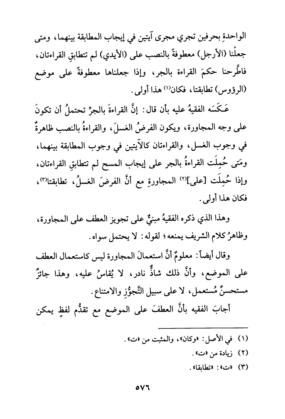 عَكَسَه الفقيهُ عليه بأن قال: إنَّ القراءةَ بالجرِّ تحتملُ أن تكونَ على وجه المجاورة، ويكون الفرضُ الغسلَ، والقراءةُ بالنصب ظاهرةٌ في وجوب الغسل، والقراءتان كالآيتين في وجوب المطابقة بينهما، ومَتى حُمِلَت القراءةُ بالجر على إيجاب المسح لم تتطابقِ القراءتان، وإذا حُمِلَت [على] (¬2) المجاورةِ مع أنْ الفرضَ الغسلُ، تطابقتا (¬3)، فكان هذا أولى.