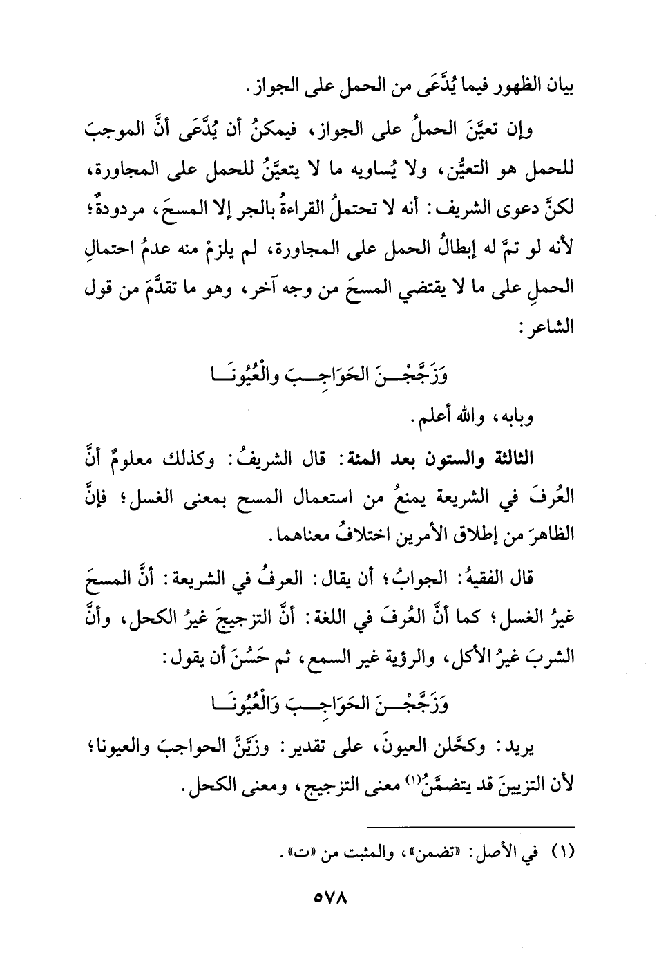 وإن تعيَّنَ الحملُ على الجواز، فيمكنُ أن يُدَّعَى أنَّ الموجبَ للحمل هو التعيّن، ولا يُساويه ما لا يتعيَّنُ للحمل على المجاورة، لكنَّ دعوى الشريف: أنه لا تحتملُ القراءةُ بالجر إلا المسحَ، مردودةٌ؛ لأنه لو تمَّ له إبطالُ العمل على المجاورة، لم يلزمْ منه عدمُ احتمالِ الحملِ على ما لا يقتضي المسحَ من وجه آخر، وهو ما تقدَّمَ من قول الشاعر: