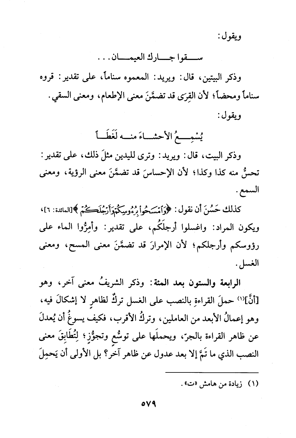 الرابعة والستون بعد المئة: وذكر الشريفُ معنى آخر، وهو [أنَّ] (¬1) حملَ القراءةِ بالنصب على الغسل تركٌ لظاهرٍ لا إشكالَ فيه، وهو إعمالُ الأبعد من العاملين، وتركُ الأقرب، فكيف يسوغُ أن يُعدلَ عن ظاهر القراءة بالجرّ، ويحملَها على توسُّعٍ وتجوُّزٍ؛ لِتُطَابِقَ معنى النصب الذي ما تَمَّ إلا بعد عدول عن ظاهر آخر؟ بل الأولى أن يَحمِلَ