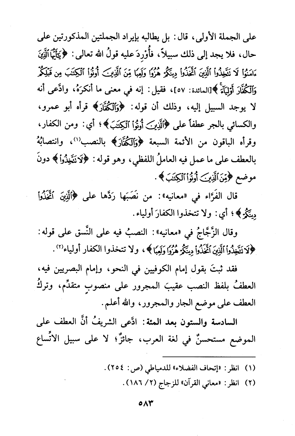 على الجملة الأولى، قال: بل يطالبه بإيراد الجملتين المذكورتين على حال، فلا يجد إلى ذلك سبيلاً، فأُوْرِدَ عليه قولُ الله تعالى: {يَاأَيُّهَا الَّذِينَ آمَنُوا لَا تَتَّخِذُوا الَّذِينَ اتَّخَذُوا دِينَكُمْ هُزُوًا وَلَعِبًا مِنَ الَّذِينَ أُوتُوا الْكِتَابَ مِنْ قَبْلِكُمْ وَالْكُفَّارَ أَوْلِيَاءَ} [المائدة: 57] فقيل: إنه في معنى ما أنكرَهُ، وادَّعى أنه لا يوجد السبيل إليه، وذلك أن قوله: {وَالْكُفَّارَ} قرأه أبو عمرو، والكسائي بالجر عطفًا على {الَّذِينَ أُوتُوا الْكِتَابَ}؛ أي: ومن الكفار، وقرأه الباقون من الأئمة السبعة {وَالْكُفَّارَ} بالنصب (¬1)، وانتصابُهُ بالعطف على ما عمل فيه العاملُ اللفظي، وهو قوله: {لَا تَتَّخِذُوا} دونَ موضع {مِنَ الَّذِينَ أُوتُوا الْكِتَابَ}.