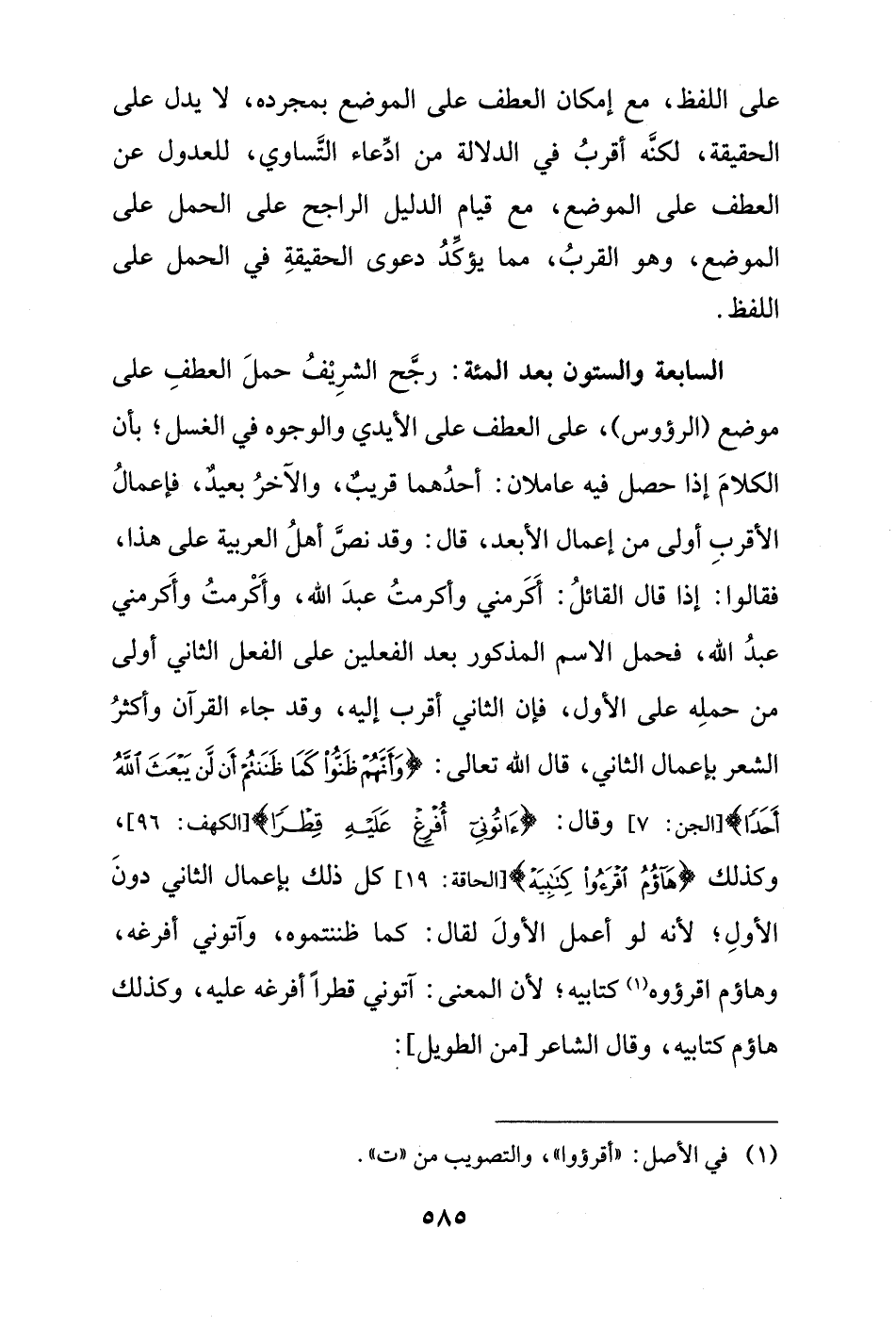 السابعة والستون بعد المئة: رجَّح الشرِيْفُ حملَ العطفِ على موضع (الرؤوس)، على العطف على الأيدي والوجوه في الغسل؛ بأن الكلامَ إذا حصل فيه عاملان: أحدُهما قريبٌ، والآخرُ بعيدٌ، فإعمالُ الأقربِ أولى من إعمال الأبعد، قال: وقد نصَّ أهلُ العربية على هذا، فقالوا: إذا قال القائلُ: أكرمني وأكرمتُ عبدَ الله، وأَكْرمتُ وأَكرمني عبدُ الله، فحمل الاسم المذكور بعد الفعلين على الفعل الثاني أولى من حملِه على الأول، فإن الثاني أقرب إليه، وقد جاء القرآن وأكثرُ الشعر بإعمال الثاني، قال الله تعالى: {وَأَنَّهُمْ ظَنُّوا كَمَا ظَنَنْتُمْ أَنْ لَنْ يَبْعَثَ اللَّهُ أَحَدًا} [الجن: 7] وقال: {آتُونِي أُفْرِغْ عَلَيْهِ قِطْرًا} [الكهف: 96] , وكذلك {هَاؤُمُ اقْرَءُوا كِتَابِيَهْ} [الحاقة: 19] كل ذلك بإعمال الثاني دونَ الأولِ؛ لأنه لو أعمل الأولَ لقال: كما ظننتموه، وآتوني أفرغه، وهاؤم اقرؤوه (¬1) كتابيه؛ لأن المعنى: آتوني قطراً أفرغه عليه، وكذلك هاؤم كتابيه، وقال الشاعر [من الطويل]: