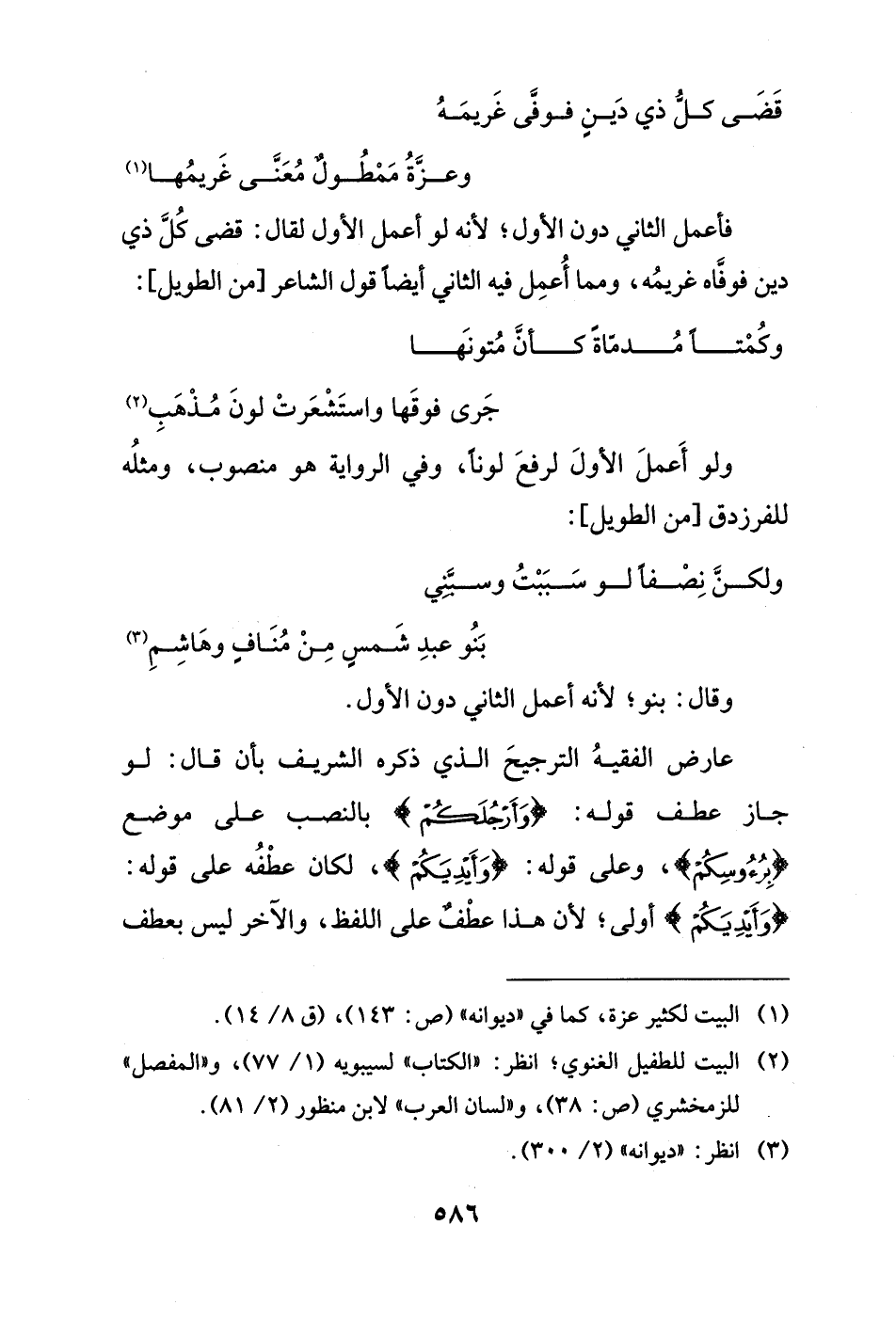 فأعمل الثاني دون الأول؛ لأنه لو أعمل الأول لقال: قضى كُلَّ ذي دين فوفَّاه غريمُه، ومما أُعمِل فيه الثاني أيضًا قول الشاعر [من الطويل]: