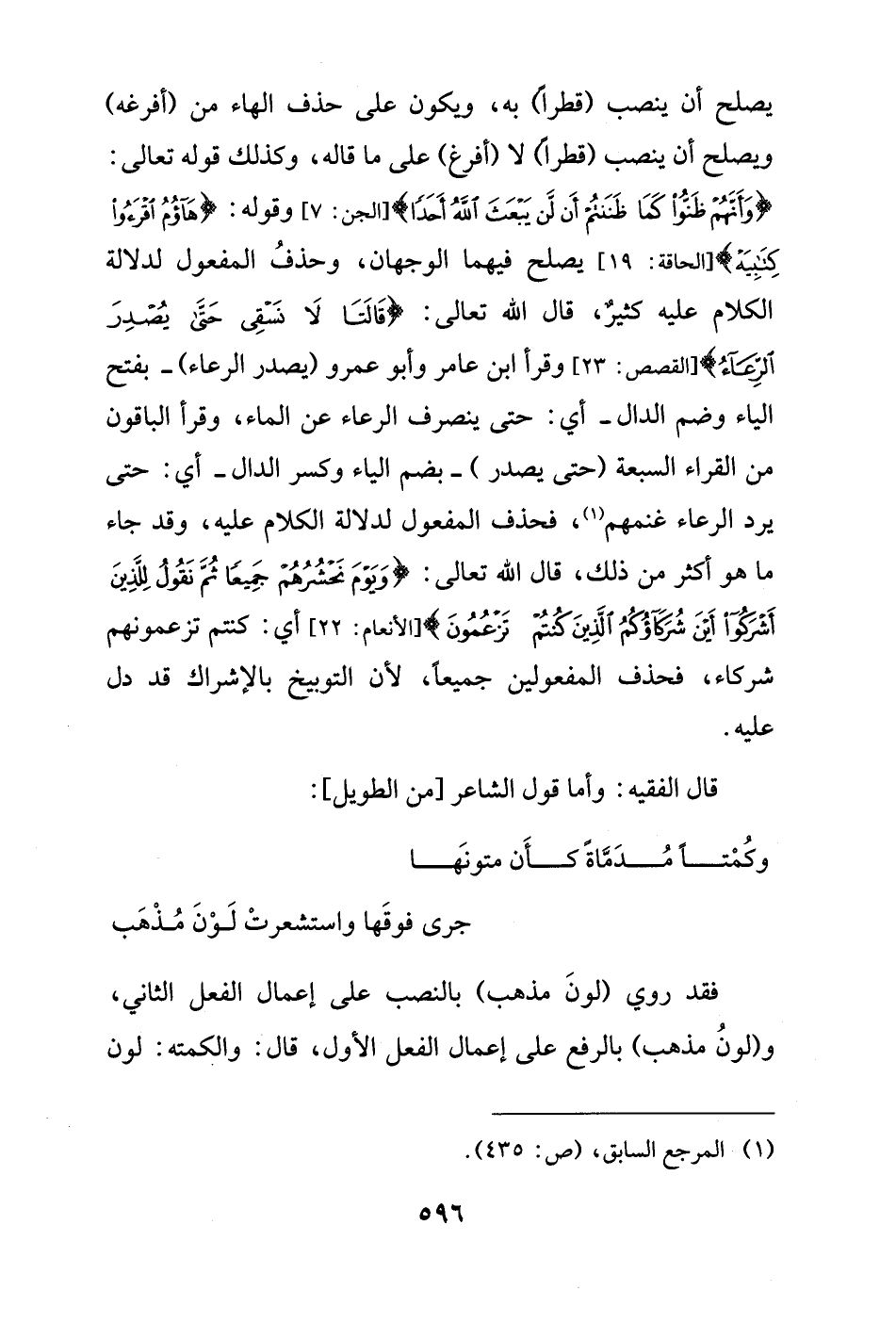 يصلح أن ينصب (قطراً) به، ويكون على حذف الهاء من (أفرغه) ويصلح أن ينصب (قطرًا) لا (أفرغ) على ما قاله، وكذلك قوله تعالى: {وَأَنَّهُمْ ظَنُّوا كَمَا ظَنَنْتُمْ أَنْ لَنْ يَبْعَثَ اللَّهُ أَحَدًا} [الجن: 7]، وقوله: {هَاؤُمُ اقْرَءُوا كِتَابِيَهْ} [الحاقة: 19]، يصلح فيهما الوجهان، وحذف المفعول لدلالة الكلام عليه كثيرٌ، قال الله تعالى: {قَالَتَا لَا نَسْقِي حَتَّى يُصْدِرَ الرِّعَاءُ} [القصص: 23] وقرأ ابن عامر وأبو عمرو (يصدر الرعاء) - بفتح الياء وضم الدال - أي: حتى ينصرف الرعاء عن الماء، وقرأ الباقون من القراء السبعة (حتى يصدر) - بضم الياء وكسر الدال - أي: حتى يرد الرعاء غنمهم (¬1)، فحذف المفعول لدلالة الكلام عليه، وقد جاء ما هو أكثر من ذلك، قال الله تعالى: {وَيَوْمَ نَحْشُرُهُمْ جَمِيعًا ثُمَّ نَقُولُ لِلَّذِينَ أَشْرَكُوا أَيْنَ شُرَكَاؤُكُمُ الَّذِينَ كُنْتُمْ تَزْعُمُونَ} [الأنعام: 22] أي: كنتم تزعمونهم شركاء، فحذف المفعولين جميعًا؛ لأن التوبيخ بالإشراك قد دل عليه.