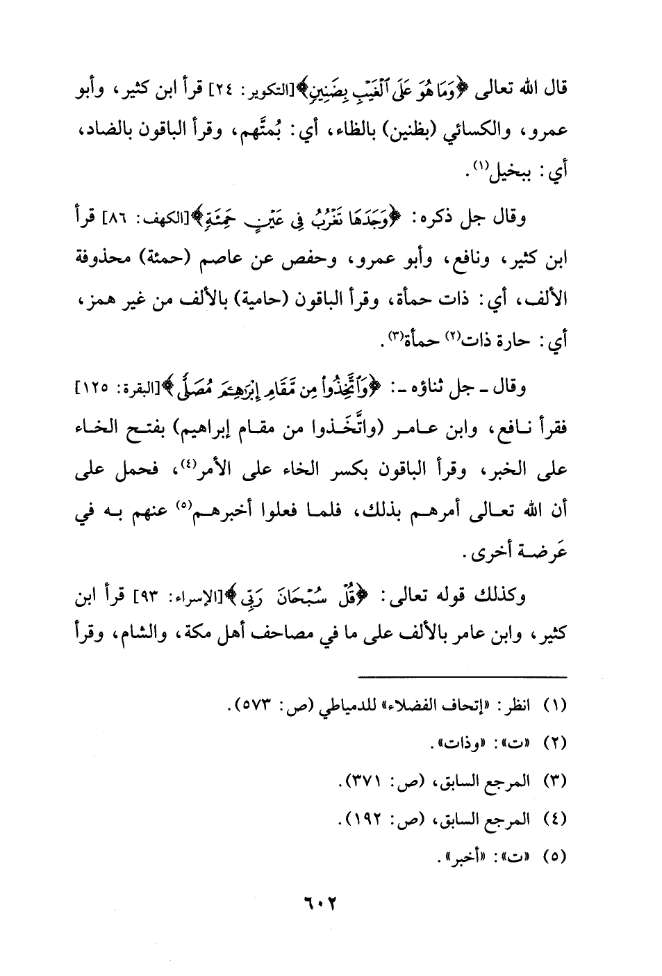 قال الله تعالى {وَمَا هُوَ عَلَى الْغَيْبِ بِضَنِينٍ} [التكوير: 24] قرأ ابن كثير، وأبو عمرو، والكسائي (بظنين) بالظاء، أي: بُمتَّهم، وقرأ الباقون بالضاد، أي: ببخيل (¬1).