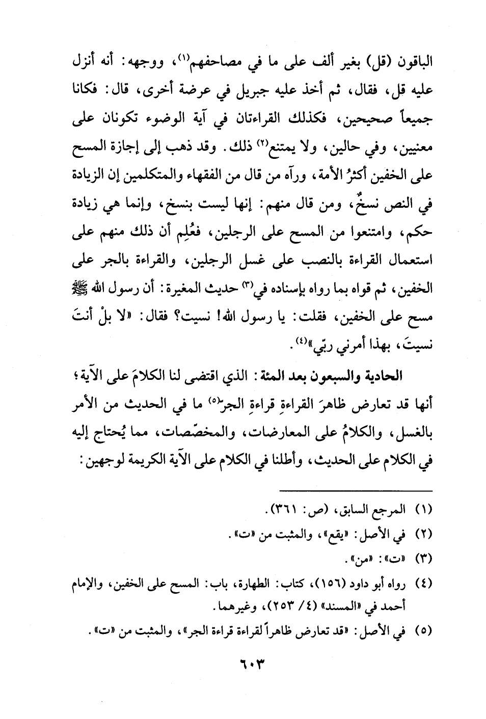 الحادية والسبعون بعد المئة: الذي اقتضى لنا الكلامَ على الآية؛ أنها قد تعارض ظاهرَ القراءةِ قراءةِ الجرّ (¬5) ما في الحديث من الأمر بالغسل، والكلامُ على المعارضات، والمخصّصات، مما يُحتاج إليه في الكلام على الحديث، وأطلنا في الكلام على الآية الكريمة لوجهين:
