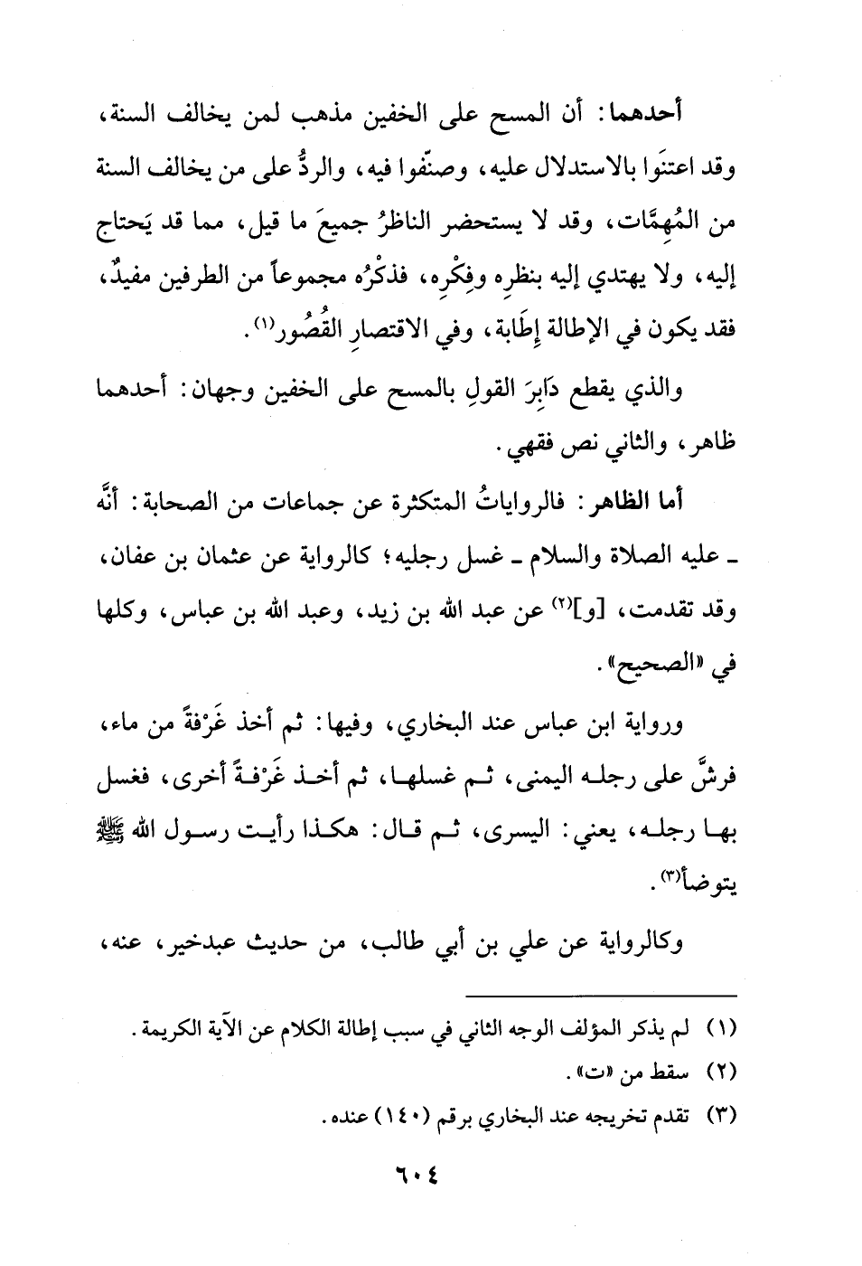 والذي يقطع دَابِرَ القولِ بالمسح على الخفين وجهان: أحدهما ظاهر، والثاني نص فقهي.