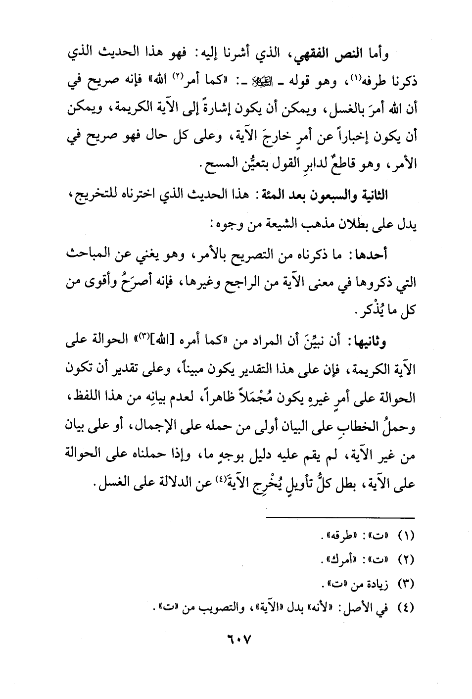 وأما النص الفقهي، الذي أشرنا إليه: فهو هذا الحديث الذي ذكرنا طرفه (¬1)، وهو قوله - عليه السلام -: "كما أمر (¬2) الله "فإنه صريح في أن الله أمرَ بالغسل، ويمكن أن يكون إشارةً إلى الآية الكريمة، ويمكن أن يكون إخباراً عن أمرٍ خارجَ الآية، وعلى كل حال فهو صريح في الأمر، وهو قاطعٌ لدابرِ القول بتعيُّن المسح.