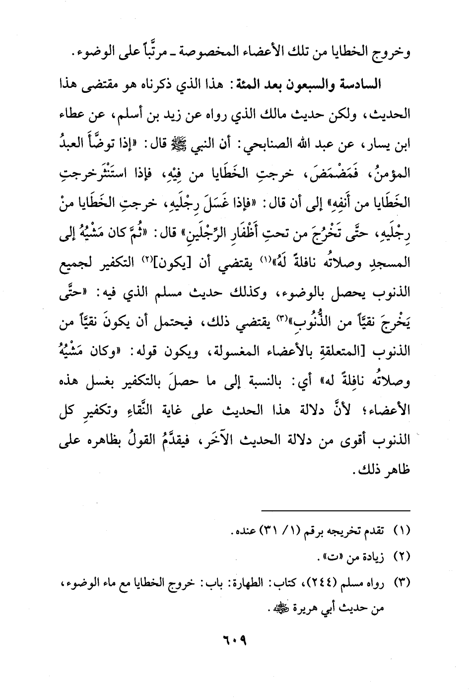 السادسة والسبعون بعد المئة: هذا الذي ذكرناه هو مقتضى هذا الحديث، ولكن حديث مالك الذي رواه عن زيد بن أسلم، عن عطاء ابن يسار، عن عبد الله الصنابحي: أن النبي - صلى الله عليه وسلم - قال: "إذا توضَّأَ العبدُ المؤمنُ، فَمَضْمَضَ، خرجتِ الخَطَايا من فِيْهِ، فإذا استَنْثَر خرجتِ الخَطَايا من أَنفِهِ" إلى أن قال: "فإذا غَسَلَ رِجْلَيهِ، خرجتِ الخَطَايا منْ رِجْلَيهِ، حتَّى تَخْرُجَ من تحتِ أَظْفَارِ الرِّجْلَينِ" قال: "ثُمَّ كان مَشْيُهُ إلى المسجدِ وصلاتُه نافلةً لَهُ" (¬1) يقتضي أن [يكون] (¬2) التكفير لجميع الذنوب يحصل بالوضوء، وكذلك حديث مسلم الذي فيه: "حتَّى يَخْرجَ نقيًّا من الذُّنُوبِ" (¬3) يقتضي ذلك، فيحتمل أن يكونَ نقيًّا من الذنوب [المتعلقةِ بالأعضاء المغسولة، ويكون قوله: "وكان مَشْيُهُ وصلاتُه نافِلةً له" أي: بالنسبة إلى ما حصلَ بالتكفير بغسل هذه الأعضاء؛ لأنَّ دلالة هذا الحديث على غاية النَّقاءِ وتكفيرِ كل الذنوب أقوى من دلالة الحديث الآخَر، فيقدَّمُ القولُ بظاهره على ظاهر ذلك.