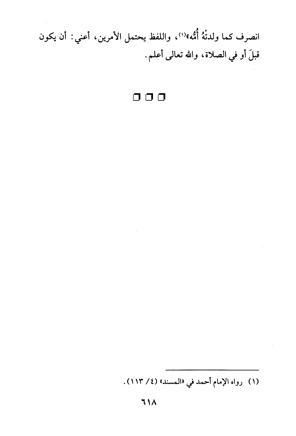 انصرف كما ولدتْهُ أُمُّه" (¬1)، واللفظ يحتمل الأمرين، أعني: أن يكون قبلَ أو في الصلاة، والله تعالى أعلم.