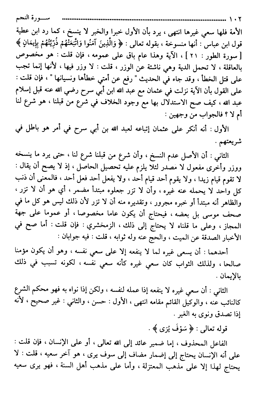 الأول: أنه أنكر على عثمان اتباعه لعبد الله بن أبي سرح في أمر هو باطل في شريعتهم. الثاني: أن الأصل عدم النسخ، وأن شرع من قبلنا شرع لنا، حتى يرد ما ينسخه. ووزر وأخرى مفعول لَا مصدر لئلا يلزم عليه تحصيل الحاصل، إذ لَا يصح أن يقال: لا تقوم قيام زيدا، ولا يقوم أحد قيام أحد، ولا يفعل أحد فعل أحد، فالمعنى أن ذنب كل واحد لَا يحمله عنه غيره، وأن لَا تزر جعلوه مبتدأ [مضمرا*]، أي هو أن لَا تزر، والظاهر أنه مبتدأ [وخبره مجرور*]، وتقديره منه أن لَا تزر؛ لأن ذلك ليس هو كل ما في صحف موسى بل بعضه، فيحتاج أن يكون عاما مخصوصا، أو عموما على جهة المجاز، وعلى ما قلناه لَا يحتاج إلى ذلك، الزمخشري: فإن قلت: أما صح في الأخبار الصدقة عن الميت، والحج عنه وله ثوابه؟ قلت: فيه جوابان: