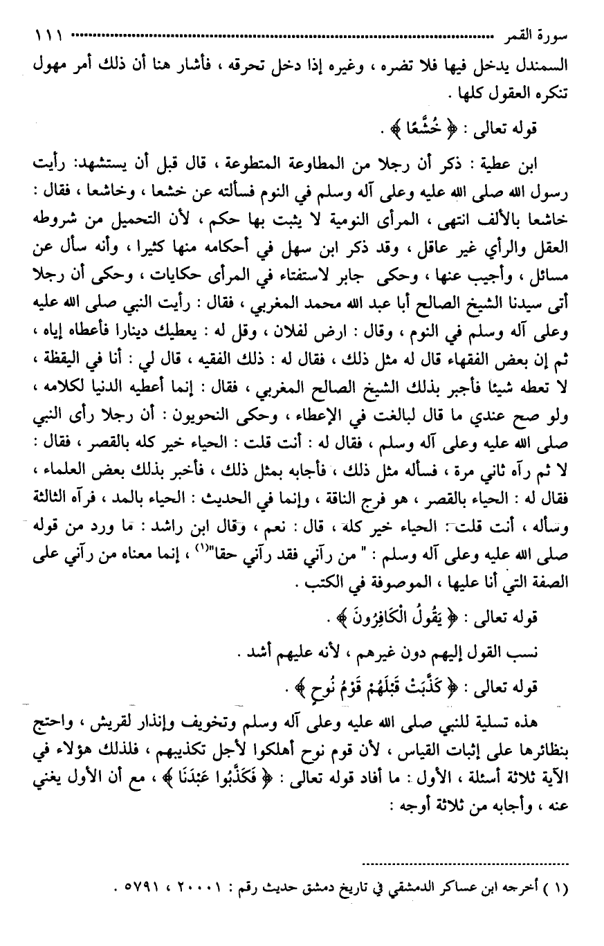 ابن عطية: ذكر أن رجلا من [المتطوعة*]، قال قبل أن يستشهد: رأيت رسول الله صلى الله عليه وعلى آله وسلم في النوم فسألته عن خشعا، وخاشعا، فقال: خاشعا بالألف. انتهى، [المرائي*] النومية لَا يثبت بها حكم، لأن [التحمل من شروطه العقل والرأى غير عاقل*]، وقد ذكر ابن سهل في أحكامه منها كثيرا، وأنه سأل عن مسائل، وأجيب عنها، وحكى جابر لاستفتاء في المرأى حكايات، وحكى أن رجلا أتى سيدنا الشيخ الصالح أبا عبد الله محمد المغربي، فقال: رأيت النبي صلى الله عليه وعلى آله وسلم في النوم، وقال: ارض لفلان، وقل له: يعطيك دينارا فأعطاه إياه، ثم إن بعض الفقهاء قال له مثل ذلك، فقال له: ذلك الفقيه، قال لي: أنا في اليقظة، لا تعطه شيئا [فأخبر*] بذلك الشيخ الصالح المغربي، فقال: إنما أعطيه الدنيا لكلامه، ولو صح عندي ما قال لبالغت في الإعطاء، وحكى النحويون: أن رجلا رأى النبي صلى الله عليه وعلى آله وسلم، فقال له: أنت قلت: الحياء خير كله بالقصر، فقال: لا ثم رآه ثاني مرة، فسأله مثل ذلك، فأجابه بمثل ذلك، فأخبر بذلك بعض العلماء، فقال له: الحياء بالقصر، هو فرج الناقة، وإنما في الحديث: الحياء بالمد، فرآه الثالثة وسأله، أنت قلت: الحياء خير كله، قال: نعم، وقال ابن [رشد*]: ما ورد من قوله صلى الله عليه وعلى آله وسلم: "من رآني فقد رآني حقا"، إنما معناه من رآني على الصفة التي أنا عليها، الموصوفة في الكتب.