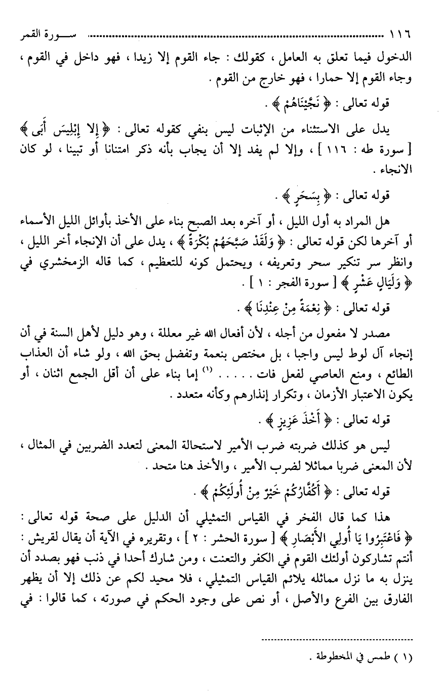 هل المراد به أول الليل، أو آخره بعد الصبح بناء على الأخذ بأوائل الليل الأسماء أو آخرها لكن قوله تعالى: (وَلَقَدْ صَبَّحَهُم بُكْرَةً)، يدل على أن الإنجاء آخر الليل، وانظر سر تنكير (سَحَرٍ) وتعريفه، ويحتمل كونه للتعظيم، كما قاله الزمخشري في (وَلَيَالٍ عَشْرٍ).