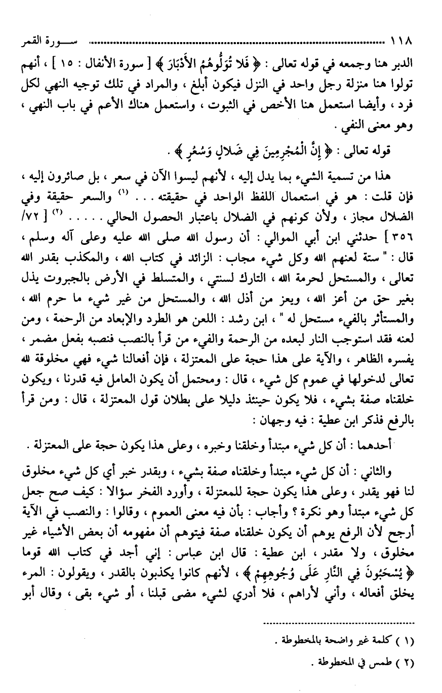 حدثني ابن أبي الموالي: أن رسول الله صلى الله عليه وعلى آله وسلم، قال: ["سِتَّةٌ أَلْعَنُهُمْ, لَعَنَهُمُ اللهُ وَكُلُّ نَبِيٍّ مُجَابٍ: الزَّائِدُ فِي كِتَابِ اللهِ عَزَّ وَجَلَّ, وَالْمُكَذِّبُ بِقَدَرِ اللهِ عَزَّ وَجَلَّ, وَالْمُتَسَلِّطُ بِالْجَبَرُوتِ يُذِلُّ بِهِ مَنْ أَعَزَّ اللهُ عَزَّ وَجَلَّ وَيُعِزُّ بِهِ مَنْ أَذَلَّ اللهُ عَزَّ وَجَلَّ، وَالتَّارِكُ لِسُنَّتِي، وَالْمُسْتَحِلُّ لِحُرُمِ اللهِ عَزَّ وَجَلَّ، وَالْمُسْتَحِلُّ مِنْ عِتْرَتِي مَا حَرَّمَ اللهُ عَزَّ وَجَلَّ"*]، ابن رشد: اللعن هو الطرد والإبعاد من الرحمة، ومن لعنه فقد استوجب النار لبعده من الرحمة، والفيء. [إِنَّا كُلَّ شَيْءٍ ... (49) *] من قرأ بالنصب فنصبه بفعل مضمر، يفسره الظاهر، والآية على هذا حجة على المعتزلة، فإِن أفعالنا شيء فهي مخلوقة لله تعالى لدخولها في عموم كل شيء، قال: ومحتمل أن يكون العامل فيه قدرنا، ويكون خلقناه صفة بشيء، فلا يكون حينئذ دليلا على بطلان قول المعتزلة، قال: ومن قرأ بالرفع فذكر ابن عطية: فيه وجهان: