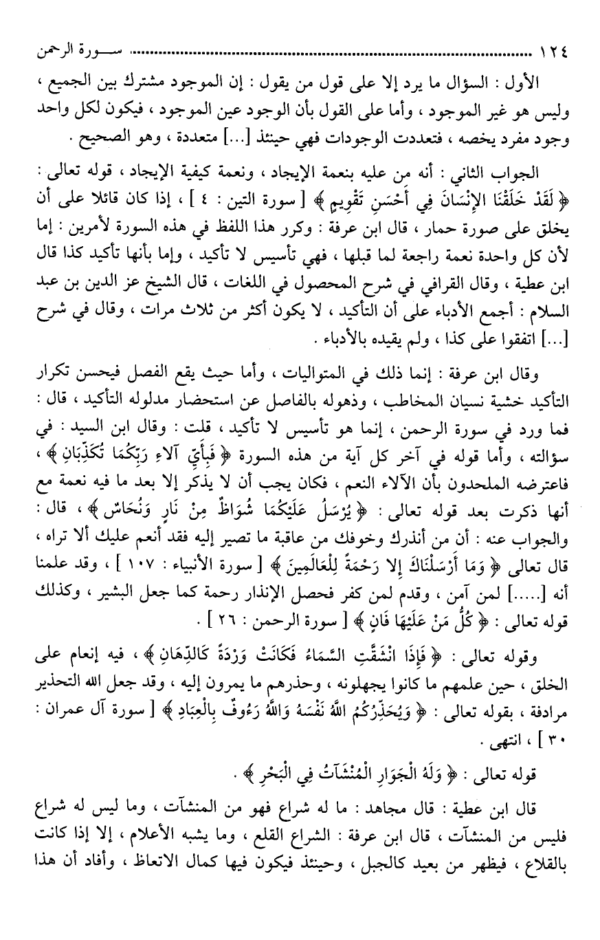 وقال ابن عرفة: إنما ذلك في المتواليات، وأما حيث يقع الفصل فيحسن تكرار التأكيد خشية نسيان المخاطب، وذهوله بالفاصل عن استحضار مدلوله التأكيد، قال: فما ورد في سورة الرحمن، إنما هو تأسيس لَا تأكيد، قلت: وقال ابن السيد: في [سؤالاته*]، وأما قوله في آخر كل آية من هذه السورة (فَبِأَيِّ آلاءِ رَبِّكُمَا تُكَذِّبَانِ)، فاعترضه الملحدون بأن الآلاء النعم، فكان يجب أن لَا يذكر إلا بعد ما فيه نعمة مع أنها ذكرت بعد قوله تعالى: (يُرْسَلُ عَلَيْكُمَا شُوَاظٌ مِنْ نَارٍ وَنُحَاسٌ)، قال: والجواب عنه: أن من أنذرك وخوفك من عاقبة ما تصير إليه فقد أنعم عليك ألا تراه، قال تعالى (وَمَا أَرْسَلْنَاكَ إِلَّا رَحْمَةً لِلْعَالَمِينَ)، وقد علمنا أنه [ ... ] لمن آمن، وقدم لمن كفر فحصل الإنذار رحمة كما جعل البشير، وكذلك قوله تعالى: (كُلُّ مَنْ عَلَيْهَا فَانٍ)