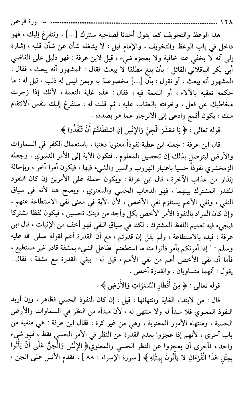 قال ابن عرفة: جعله ابن عطية نفوذاً معنويا ذهنيا، باستعمال [الفكر*] في السماوات والأرض ليتوصل بذلك إن تحصيل المعلوم، فتكون الآية إلى الأمر الدنيوي، وجعله الزمخشري نفوذا حسيا باعتبار الهروب والسير والشيء فيها، فيكون أمرا آخر، وبإحالة إنذار من عذاب الآخرة، قال ابن عرفة: ويكون جملة على الأمرين إن كان النفوذ للقدر المشترك بينهما، فهو الذهاب الحسي والمعنوي، ويصح هنا لأنه في سياق النفي، ونفي الأعم يستلزم نفي الأخص، لأن الآية في معنى نفي الاستطاعة عنهم، وإن كان المراد بالنفوذ الأمر الأخص بكل [واحد من ذينك تحسين*]، فيكون لفظا مشتركا فيجيء فيه تعميم اللفظ المشترك، لكنه في سياق النفي فهو أخف من الإثبات، قال ابن عرفة: قيده بالاستطاعة، ولم يقل إن قدرتم، مع أن القدرة أعم لقوله صلى الله عليه وسلم: "إِذَا أَمَرْتُكُمْ بِأَمْرٍ فَأْتُوا مِنْهُ مَا اسْتَطَعْتُمْ" ففاعل الشيء بمشقة قادر غير مستطيع، فأما أن نفي الأخص أعم من نفي الأعم، قيل له: يبقي القدرة مع مشقة، فقال. يقول: أنهما متساويان، والقدرة أخص.