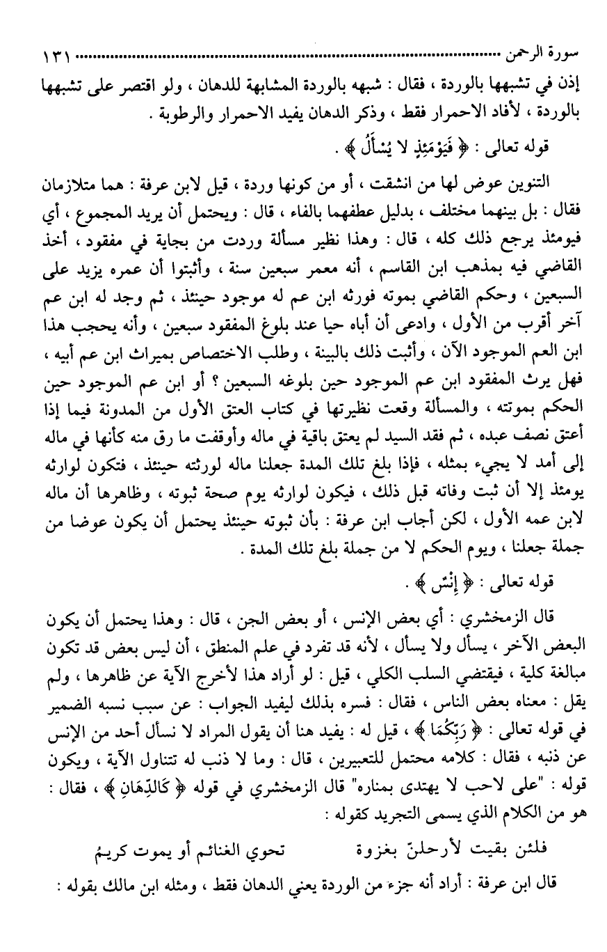 قال الزمخشري: أي بعض الإنس، أو بعض الجن، قال: وهذا يحتمل أن يكون البعض الآخر، يسأل ولا يسأل، لأنه قد تفرد في علم المنطق، أن ليس بعض قد تكون مبالغة كلية، فيقتضي السلب الكلي، قيل: لو أراد هذا لأخرج الآية عن ظاهرها، ولم يقل: معناه بعض النَّاس، فقال: فسره بذلك ليفيد الجواب: عن سبب نسبه الضمير في قوله تعالى: (رَبِّكُمَا)، قيل له: يفيد هنا أن يقول المراد لَا نسأل [أحدا*] من الإنس عن ذنبه، فقال: كلامه محتمل للتعبيرين، قال: وما لَا ذنب له [تتناوله الآية، ويكون كقوله*]: "عَلَى لَاحِبٍ لَا يَهْتَدِي بِمَنَارِهِ" قال الزمخشري في قوله (كَالدِّهَانِ)، فقال: هو من الكلام الذي يسمى التجريد كقوله: