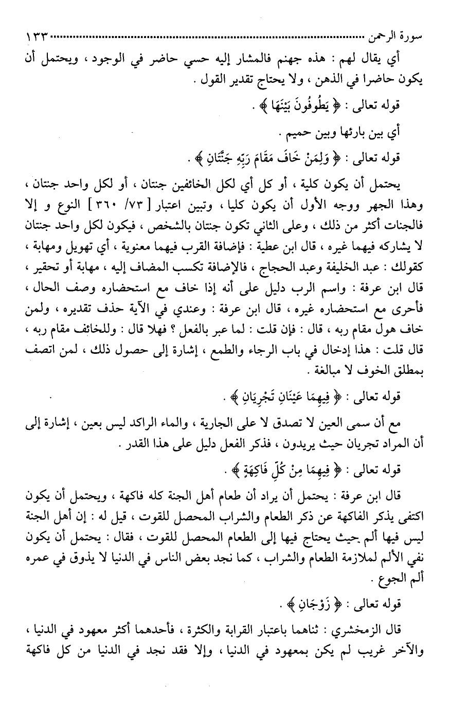 يحتمل أن يكون كلية، أو [كلًّا*]، أي لكل الخائفين جنتان، أو لكل واحد جنتان، وهذا [وجه*] ووجه الأول أن يكون كليا، [وتثْنيةُ (جَنَّتَان) باعتبار*] النوع، وإلا فالجنات أكثر من ذلك، وعلى الثاني تكون جنتان [للشخص*]، فيكون لكل واحد جنتان لا يشاركه فيهما غيره، قال ابن عطية: فإضافة القرب فيهما معنوية، أي تهويل ومهابة، كقولك: عبد الخليفة وعبد الحجاج، فالإضافة تكسب المضاف إليه، مهابة أو [تحقيرا*]، قال ابن عرفة: واسم الرب دليل على أنه إذا خاف مع استحضاره وصف الحال، فأحرى مع استحضاره غيره، قال ابن عرفة: وعندي في الآية حذف تقديره، ولمن خاف هول مقام ربه، قال: فإن قلت: لما عبر بالفعل؟ فهلا قال: وللخائف مقام ربه؟ قال قلت: هذا إدخال في باب الرجاء والطمع، إشارة إلى حصول ذلك، لمن اتصف بمطلق الخوف لَا مبالغة.