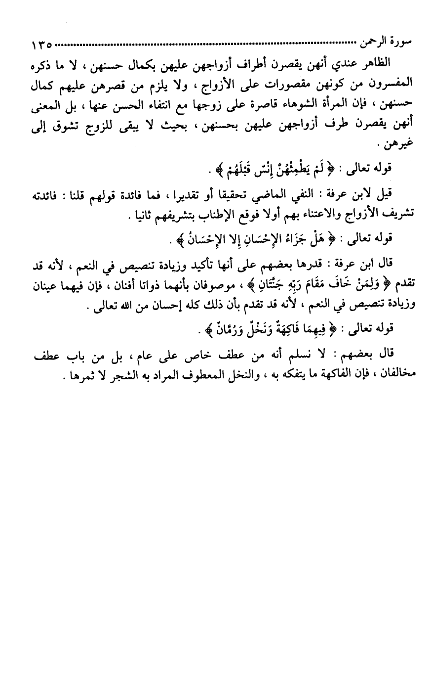 الظاهر عندي أنهن يقصرن أطراف أزواجهن عليهن بكمال حسنهن، لَا ما ذكره المفسرون من كونهن مقصورات على الأزواج، ولا يلزم من قصرهن عليهم كمال حسنهن، فإِن المرأة الشوهاء قاصرة على زوجها مع انتفاء الحسن عنها، [بل*] المعنى أنهن يقصرن طرف أزواجهن عليهن بحسنهن، بحيث لَا يبقى للزوج تشوق إلى غيرهن.
