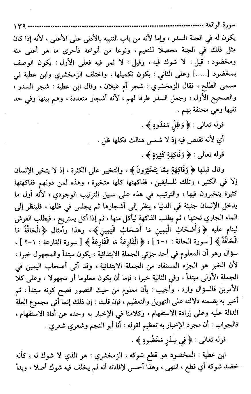 يكون له في الجنة السدر، وإمَّا لأنه من باب التنبيه بالأدنى على الأعلى، لأنه إذا كان مثل ذلك في الجنة محصلا للنعيم، ونوعا من أنواعه، فأحرى ما هو أعلى منه. ومخضود، قيل: لَا شوك فيه، وقيل: لَا ثمر فيه، فعلى الأول: يكون الوصف بـ (مخضود) [حاجيًّا*] وعلى الثاني: يكون [تكميليا*]، واختلف الزمخشري وابن عطية في مسمى الطلح، فقال الزمخشري: شجر أم غيلان، وقال ابن عطية: شجر السدر، والصحيح الأول، وجعل السدر [ظرفا لهم*]، لأنه أشجار متعددة، وهم بينها، [وفي حديقتها*] وهي محتفة بهم.