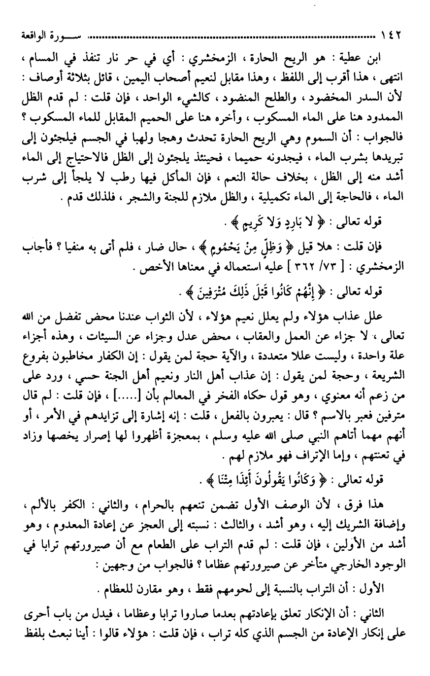علل عذاب هؤلاء ولم يعلل نعيم هؤلاء، لأن الثواب عندنا محض تفضل من الله تعالى، لَا جزاءً عن العمل، والعقاب محض عدل، وجزاء عن السيئات، وهذه أجزاء علة واحدة، وليست عللا متعددة، والآية حجة لمن يقول: إن الكفار مخاطبون بفروع الشريعة، وحجة لمن يقول: إن عذاب أهل النار، ونعيم أهل الجنة حسي، ورد على من زعم أنه معنوي، وهو قول حكاه الفخر في المعالم بأن [ ... ]، فإِن قلت: لم قال مترفين [(45) *] فعبر بالاسم؟ [وعادتهم*]: يعبرون بالفعل، قلت: إنه إشارة إلى تزايدهم في الأمر، أو أنهم مهما أتاهم النبي صلى الله عليه وسلم بمعجزة أظهروا لها [**إنكارا يخصها] وزاد في تعنتهم، وأما الإتراف فهو ملازم لهم.