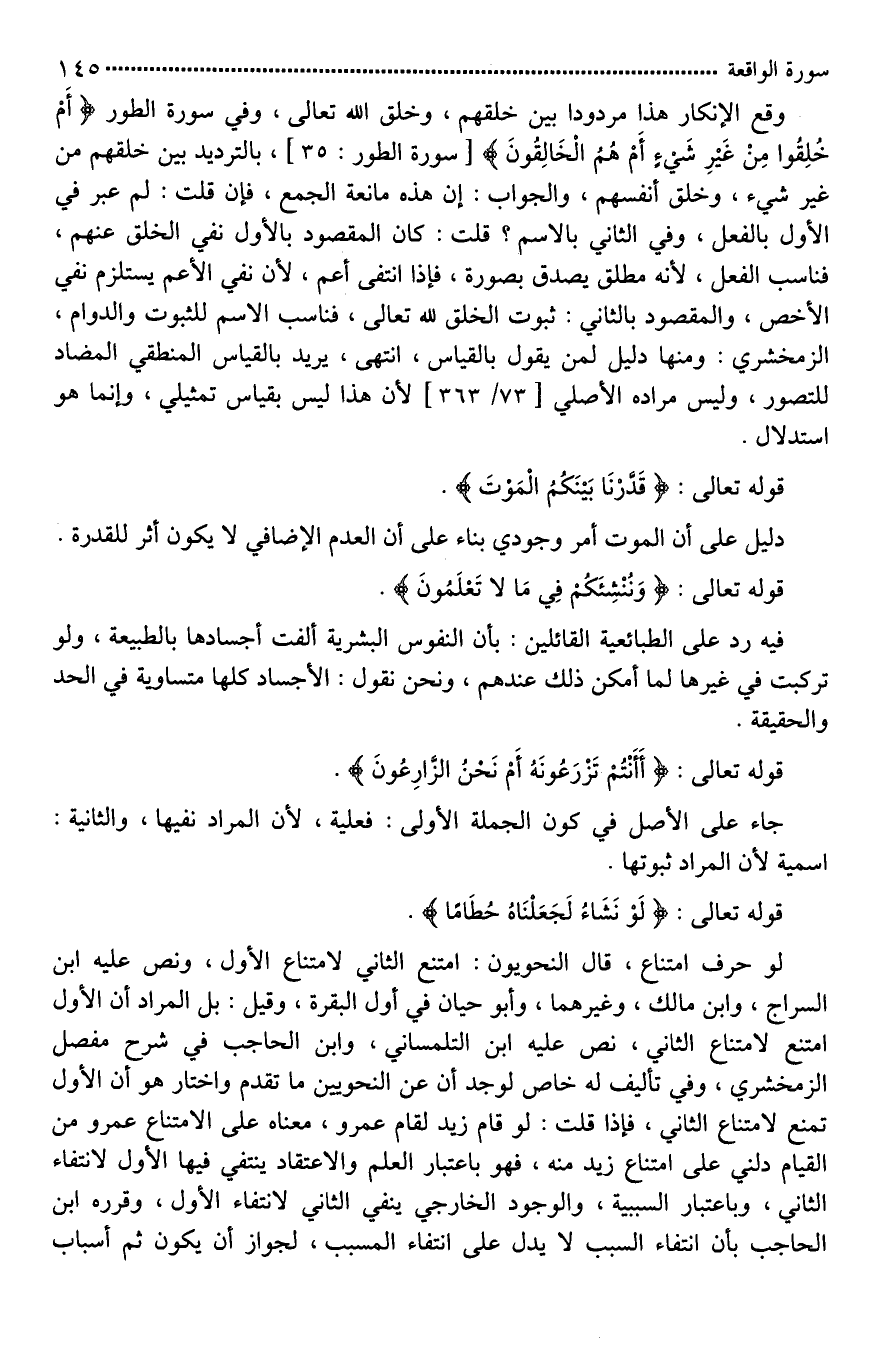 وقع الإنكار هذا [ترديد*] بين خلقهم، وخلق الله تعالى، وفي سورة الطور (أَمْ خُلِقُوا مِنْ غَيْرِ شَيءٍ أَمْ هُمُ الْخَالِقُونَ)، بالترديد بين خلقهم من غير شيء، وخلق أنفسهم، والجواب: إن هذه مانعة الجمع، فإن قلت: لم عبر في الأول بالفعل، وفي الثاني بالاسم؟ قلت: كان المقصود بالأول نفي الخلق عنهم، فناسب الفعل، لأنه مطلق يصدق بصورة، فإذا انتفى [عم*]، لأن نفي الأعم يستلزم نفي الأخص، والمقصود بالثاني: ثبوت الخلق لله تعالى، فناسب الاسم للثبوت والدوام، الزمخشري: ومنها دليل لمن يقول بالقياس، انتهى، يريد بالقياس المنطقي المضاد للتصور، وليس مراده الأصلي؛ لأن هذا ليس بقياس تمثيلي، وإنما هو استدلال.