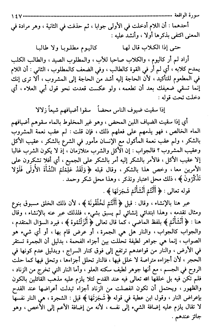 أي إذا سقيت الضياف اللبن المحض، وهو غير المخلوط بالماء سقوهم أضيافهم الماء الخالص، فهو يذمهم على فعلهم ذلك، فإِن قلت: لم عقب نعمة المشروب بالشكر، ولم [يعقب*] نعمة المأكول مع [أن*] الإنسان مأمور في الشرع بالشكر، عقيب الأكل وعقيب المشروب؟ فالجواب: إن الأكل والشرب متلازمان، إذ لَا يكون الشرب غالبا إلا عقيب الأكل، فالأمر بالشكر إليه أمر بالشكر على الجميع، أي أفلا تشكرون على الأمرين معا، وخص هذا بالشكر، وقال قبله (وَلَقَدْ عَلِمْتُمُ النَّشْأَةَ الْأُولَى فَلَوْلَا تَذَكَّرُونَ)، ذلك محل اعتبار وتذكر، وهذا محل شكر وحمد.