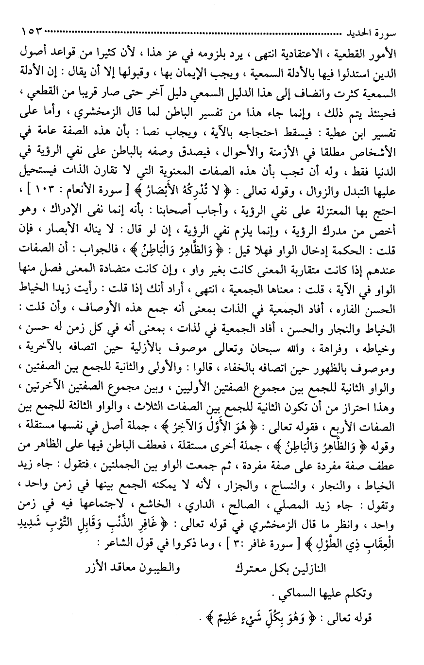 الأمور القطعية، الاعتقادية انتهى، يرد بلزومه في [غير هذا*]، لأن كثيرا من قواعد أصول الدين استدلوا فيها بالأدلة السمعية، ويجب الإيمان بها، وقبولها إلا أن يقال: إن الأدلة السمعية كثرت وانضاف إلى هذا الدليل السمعي دليل آخر حتى صار قريبا من القطعي، فحينئذٍ يتم ذلك، وإنما جاء هذا من تفسير الباطن لما قال الزمخشري، وأما على تفسير ابن عطية: فيسقط احتجاجه بالآية، ويجاب نصا: بأن هذه الصفة عامة في الأشخاص مطلقا في الأزمنة والأحوال، فيصدق وصفه بالباطن على نفي الرؤية في الدنيا فقط، وله أن [يجيب*] بأن هذه الصفات المعنوية التي لَا تقارن الذات فيستحيل عليها التبدل والزوال، وقوله تعالى: (لَا تُدْرِكُهُ الأَبْصَارُ)، احتج بها المعتزلة على نفي الرؤية، وأجاب أصحابنا: بأنه إنما نفى الإدراك، وهو أخص من [مطلق الرؤية*]، وإنما يلزم نفي الرؤية، لو قال: [لَا تناله الأبصار*]، فإن قلت: [ما*] الحكمة إدخال الواو فهلا قيل: [(الظَّاهِرُ الْبَاطِنُ) *]، فالجواب: أن الصفات عندهم إذا كانت متقاربة المعنى كانت بغير واو، وإن كانت متضادة المعنى فصل [بينها بالواو*] في الآية، قلت: معناها الجمعية، انتهى، أراد أنك إذا قلت: رأيت زيدا الخياط الحسن الفَارِه، أفاد الجمعية في الذات بمعنى أنه جمع هذه الأوصاف، وإن قلت: الخياط والنجار والحسن، أفاد الجمعية في الذات، بمعنى أنه في كل زمن له حسن، وخياطه، وفراهة، والله سبحان وتعالى موصوف بالأزلية حين اتصافه بالآخرية، وموصوف بالظهور حين اتصافه بالخفاء، قالوا: والأولى والثانية للجمع بين الصفتين، والواو الثانية للجمع بين مجموع الصفتين الأوليين، وبين مجموع الصفتين الآخرتين، وهذا احتراز من أن تكون الثانية للجمع بين الصفات الثلاث، والواو الثالثة للجمع بين الصفات الأربع، فقوله تعالى: (هُوَ الأَوَّلُ وَالآخِرُ)، جملة أصل في نفسها مستقلة، وقوله (وَالظَّاهِرُ وَالْبَاطِنُ)، جملة أخرى مستقلة، فعطف الباطن فيها على الظاهر من عطف صفة مفردة على صفة مفردة، ثم جمعت الواو بين الجملتين، فتقول: جاء زيد الخياط، والنجار، والنساج، والجزار، لأنه لَا يمكنه الجمع بينها في زمن واحد، وتقول: جاء زيد المصلي، الصالح، [الداعي*]، الخاشع، لاجتماعها فيه في زمن واحد، وانظر ما قال الزمخشري في قوله تعالى: (غَافِرِ الذَّنْبِ وَقَابِلِ التَّوْبِ شَدِيدِ الْعِقَابِ ذِي الطَّوْلِ)، وما ذكروا في قول الشاعر: