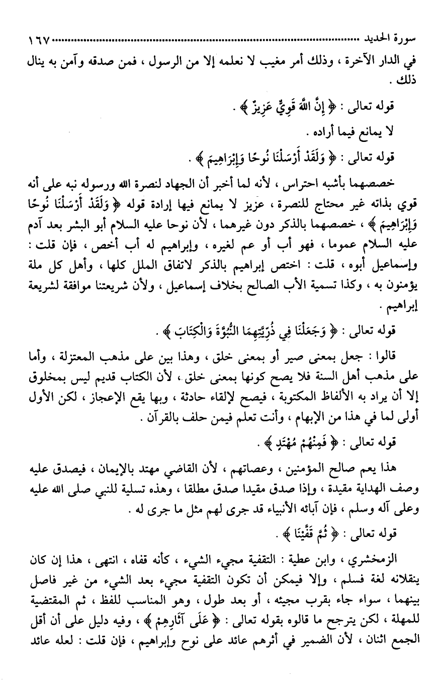 [خصصهما أشبه باحتراس*]، لأنه لما أخبر أن الجهاد لنصرة الله ورسوله نبه على أنه قوي بذاته غير محتاج للنصرة، عزيز لَا يمانع [فيما أراده*]. قوله (وَلَقَدْ أَرْسَلْنَا نُوحًا وَإِبْرَاهِيمَ)، خصصهما بالذكر دون غيرهما، لأن نوحا عليه السلام أبو البشر بعد آدم عليه السلام عموما، فهو أب أو عم لغيره، وإبراهيم له أب أخص، فإن قلت: وإسماعيل أبوه، قلت: اختص إبراهيم بالذكر لاتفاق الملل كلها، وأهل كل ملة يؤمنون به، وكذا تسمية الأب الصالح بخلاف إسماعيل، ولأن شريعتنا موافقة لشريعة إبراهيم.