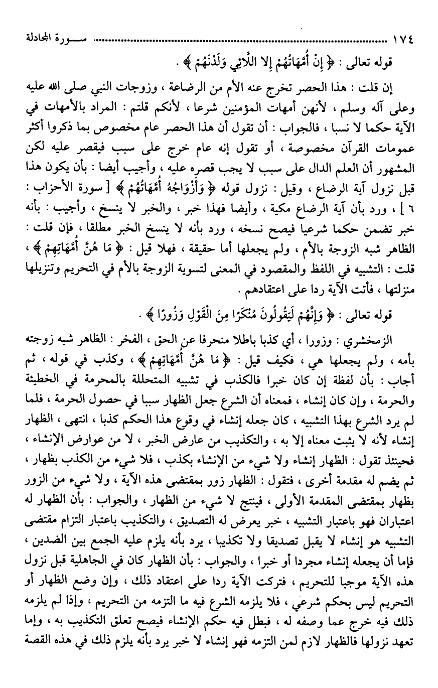 الزمخشري: (وَزُورًا)، أي كذبا باطلا منحرفا عن الحق، الفخر: الظاهر شبه زوجته بأمه، ولم يجعلها هي، فكيف قيل: (مَا هُنَّ أُمَّهَاتِهِمْ)، وكذب في قوله، ثم أجاب: بأن لفظة إن كان خبرا فالكذب في تشبيه المتحللة بالمحرمة في الخطيئة والحرمة، وإن كان إنشاء، فمعناه أن الشرع جعل الظهار سببا في حصول الحرمة، فلما لم يرد الشرع بهذا التشبيه، كان جعله إنشاء في وقوع هذا الحكم كذبا، انتهى، الظهار إنشاء لأنه لَا يثبت معناه إلا به، والتكذيب من عارض الخبر، لَا من عوارض الإنشاء، فحينئذٍ تقول: الظهار إنشاء ولا شيء من الإنشاء بكذب، فلا شيء من الكذب بظهار، ثم يضم له مقدمة أخرى، فتقول: الظهار زور بمقتضى هذه الآية، ولا شيء من الزور بظهار بمقتضى المقدمة الأولى، فينتج لَا شيء من الظهار، والجواب: بأن الظهار له اعتباران فهو باعتبار التشبيه، خبر يعرض له التصديق، والتكذيب باعتبار التزام مقتضى التشبيه هو إنشاء لَا يقبل تصديقا ولا تكذيبا، يرد بأنه يلزم عليه الجمع بين الضدين، فإما أن يجعله إنشاء مجردا أو خبرا، والجواب: بأن الظهار كان في الجاهلية قبل نزول هذه الآية موجبا للتحريم، فتركت الآية ردا على اعتقاد ذلك، وإن وضع الظهار أو التحريم ليس بحكم شرعي، فلا يلزمه الشرع فيه ما التزمه من التحريم، وإذا لم يلزمه ذلك فيه خرج عما وصفه له، فبطل فيه حكم الإنشاء فيصح تعلق التكذيب به، وإما تعهد نزولها فالظهار لازم لمن التزمه فهو إنشاء لَا خبر يرد بأنه يلزم ذلك في هذه القصة