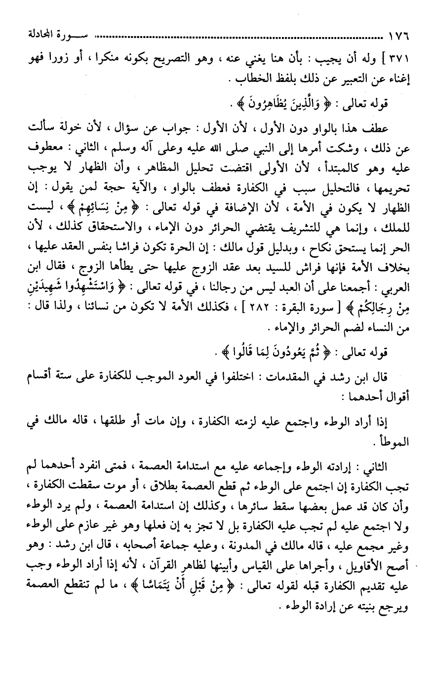 عطف هذا بالواو دون الأول، لأن الأول: جواب عن سؤال، لأن خولة سألت عن ذلك، وشكت أمرها إلى النبي صلى الله عليه وعلى آله وسلم، الثاني: معطوف عليه وهو كالمبتدأ، لأن الأولى اقتضت تحليل المظاهر، وأن الظهار لَا يوجب تحريمها، فالتحليل سبب في الكفارة فعطف بالواو، والآية حجة لمن يقول: إن الظهار لَا يكون في الأَمَة، لأن الإضافة في قوله تعالى: (مِنْ نِسَائِهِم)، ليست للملك، وإنما هي للتشريف [فيقتضي*] الحرائر دون الإماء، والاستحقاق كذلك، لأن الحر إنما يستحق [النكاح*]، وبدليل قول مالك: إن الحرة تكون فراشا بنفس العقد عليها، بخلاف الأمة فإنها فراش للسيد بعد عقد الزوج عليها حتى يطأها الزوح، فقال ابن العربي: أجمعنا على أن العبد ليس من رجالنا، في قوله تعالى: (وَاسْتَشْهِدُوا شَهِيدَيْنِ مِنْ رِجَالِكُمْ)، فكذلك الأمة لَا تكون من نسائنا، ولذا قال: من النساء لضم الحرائر والإماء.
