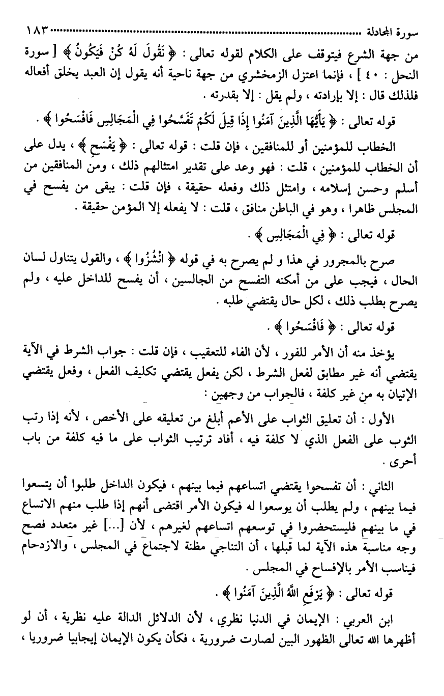 الثاني: أن (تفسحوا) يقتضي اتساعهم فيما بينهم، فيكون الداخل طلبوا أن يتسعوا فيما بينهم، ولم يطلب أن يوسعوا له، فيكون الأمر اقتضى أنهم إذا طلب منهم الاتساع في ما بينهم فليستحضروا في توسعهم اتساعهم لغيرهم، لأن [ ... ] غير متعدد فصح وجه مناسبة هذه الآية لما قبلها، أن التناجي مظنة [للاجتماع*] في المجلس، والازدحام، فيناسب الأمر بالإفساح في المجلس.