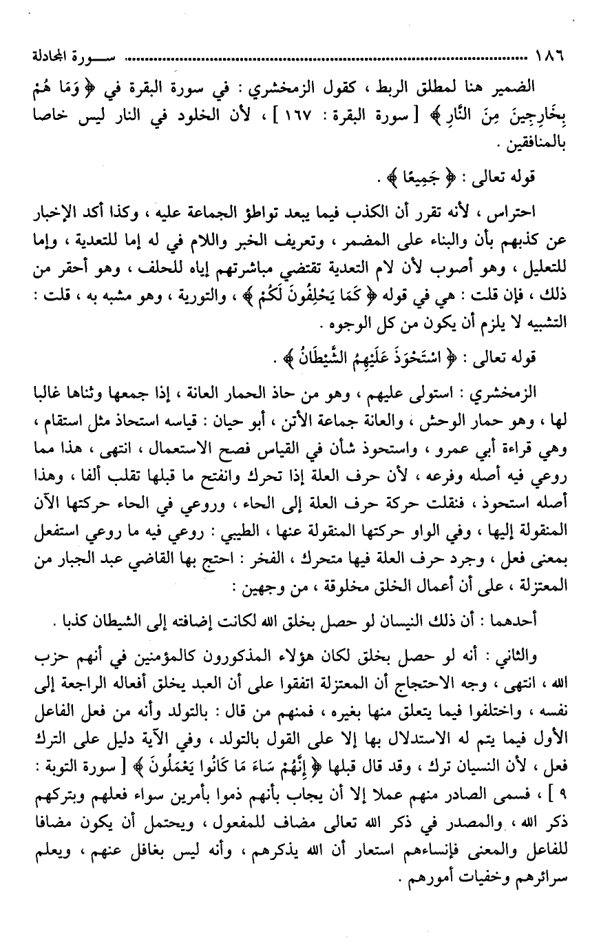 والثاني: أنه لو حصل بخلق لكان هؤلاء المذكورون كالمؤمنين في أنهم حزب الله، انتهى، وجه الاحتجاج أن المعتزلة اتفقوا على أن العبد يخلق أفعاله الراجعة إلى نفسه، واختلفوا فيما يتعلق منها بغيره، فمنهم من قال: بالتولد وأنه من فعل الفاعل الأول [فما*] يتم له الاستدلال بها إلا على القول بالتولد، وفي الآية دليل على الترك [في الفعل*]، لأن النسيان ترك، وقد قال قبلها (إِنهُم سَاءَ مَا كَانُوا يَعْمَلُونَ)، فسمى الصادر [عنهم*] عملا؛ إلا أن يجاب بأنهم ذموا بأمرين سواء فعلهم وبتركهم ذكر الله، والمصدر في ذكر الله تعالى مضاف للمفعول، ويحتمل أن يكون مضافا للفاعل، والمعنى [فإنساؤهم أنساهم*] أن الله يذكرهم، وأنه ليس بغافل عنهم، ويعلم سرائرهم وخفيات أمورهم.