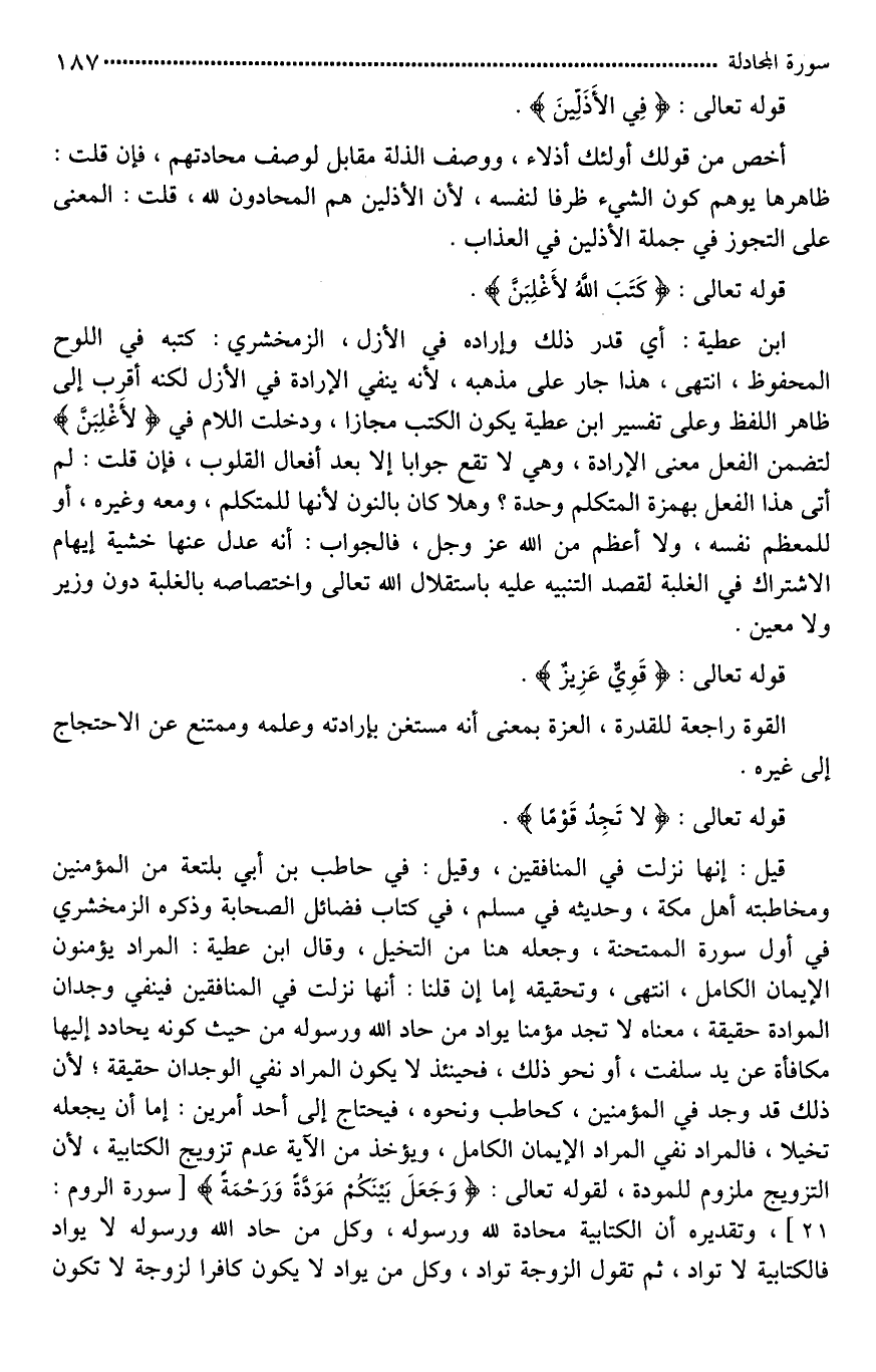 قيل: إنها نزلت في المنافقين، وقيل: في حاطب بن أبي بلتعة من المؤمنين ومخاطبته أهل مكة، وحديثه في مسلم، في كتاب فضائل الصحابة، وذكره الزمخشري في أول سورة الممتحنة، وجعله هنا من التخيل، وقال ابن عطية: المراد يؤمنون الإيمان الكامل، انتهى، وتحقيقه [أنَّا*] إن قلنا: أنها نزلت في المنافقين فينفي وجدان الموادة حقيقة، معناه لَا تجد مؤمنا يواد من حاد الله ورسوله من حيث كونه يحادد إليها مكافأة عن يد سلفت، أو نحو ذلك، فحينئذ لَا يكون المراد نفي الوجدان حقيقة؛ لأن ذلك قد وجد في المؤمنين، كحاطب ونحوه، فيحتاج إلى أحد أمرين: إما أن يجعله تخيلا، فالمراد نفي المراد الإيمان الكامل، ويؤخذ من الآية عدم تزويج الكتابية، لأن التزويج ملزوم للمودة، لقوله تعالى: (وَجَعَلَ بَيْنَكُمْ مَوَدَّةً وَرَحْمَةً)، وتقديره أن الكتابية محادة لله ورسوله، وكل من حاد الله ورسوله لَا يواد، فالكتابية لَا تواد، ثم تقول الزوجة تواد، وكل من يواد لَا يكون كافرا [فالزوجة*] لَا تكون