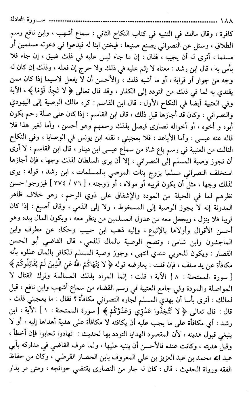 كافرة، وقال مالك في [العتبية*] في كتاب النكاح الثاني: سماع أشهب، وابن نافع رسم الطلاق، وسئل عن النصراني يصنع صنيعا، فيختن ابنا له فيدعوا في دعوته مسلمين أو مسلما، أترى له أن يجيبه، فقال: إن ما جاء ليس عليه في ذلك ضيق، إن جاء فلا بأس به، قال ابن رشد: معناه لَا إثم عليه في ذلك ولا حرج إن فعله، وذلك إن كان له وجه من جوار أو قرابة، أو ما أشبه ذلك، والأحسن أن لَا يفعل لاسيما إذا كان ممن يقتدى به؛ لما في ذلك من التودد إلى الكفار، وقد قال تعالى (لَا تَجِدُ قَوْمًا)، الآية وفي العتبية أيضا في النكاح الأول، قال ابن القاسم: كره مالك الوصية إلى اليهودي والنصراني، وكان قد أجازها قبل ذلك، قال ابن القاسم: إذا كان على صلة رحم يكون أبوه وأخوه، أو أخواله نصارى فيصل بذلك رحمهم وهو أحسن، وأما لغير هذا فلا. قاله عنه عيسى: وأما الأباعد، فلا يعجبني، نقله ابن يونس في الوصايا، وفي النكاح الثالث من العتبية في رسم باع شاة من سماع عيسى ابن دينار، قال ابن القاسم: لَا أرى أن تجوز وصية المسلم إلى النصراني، إلا أن يرى السلطان لذلك وجها، فإن أجازها استخلف النصراني مسلما يزوج بنات الموصي بالمسلمات، ابن رشد، قوله: يرى لذلك وجها، مثل أن يكون قريبه أو مولاه، أو زوجته، فيزوجوا [حسب*] نظرهم لما في الحيلة من المودة والإشفاق على ذوي الرحم، وهو خلاف ظاهر المدونة إنه لَا تجوز الوصية إلى الْمَسْخُوطِ، ولا إلى الذمي، وقال أصبغ: إذا كان قريبا فلا ينزل، ويجعل معه من عدول المسلمين من ينظر معه، ويكون المال بيده وهو أحسن الأقوال وأولاها بالإتباع، وإليه ذهب ابن حبيب وحكاه عن مطرف وابن الماجشون [وابن شاش*]، وتصح الوصية بالمال للذمي، قال القاضي أبو الحسن القصار: ويكون للحربي عندي انتهى، وجوز وصية المسلم للكافر بالمال عللوه بأنه مكافأة عن يد [سلفت*]، فإن قلت: يعارضه قوله (لَا يَنْهَاكُمُ اللَّهُ عَنِ الَّذِينَ لَمْ يُقَاتِلُوكُمْ) الآية، قلت: إنما المراد بذلك المسالمة وترك القتال لا المواصلة والمودة، وفي جامع العتبية في رسم القضاء من سماع أشهب وابن نافع، قيل لمالك: أترى بأسا أن يهدي المسلم لجاره النصراني مكافأة؟ فقال: ما يعجبني ذلك، قال: قال تعالى (لَا تَتَّخِذُوا عَدُوِّي وَعَدُوَّكُمْ) الآية، ابن رشد: أي مكافأة على ما يجب عليه أن يكافئه لَا مكافأة على هدية أهداها إليه، أو لا ينبغي قبول هديته، لأن المقصود [من*] الهدايا التودد بها لحديث: "تَهَادَوْا تَحَابُّوا" فإن أخطأ، وقبل هديته، وكانت عنده، فالأحسن أن [ينبه عليها*]، ولما عرف القاضي في مداركه بأبي عبد الله محمد بن عبد العزيز بن علي المعروف بابن الحصار القرطبي، وكان من حفاظ الفقه ورواة الحديث، قال: كان له جار من النصارى [يقضي*] حوائجه، ومتى مر بدار