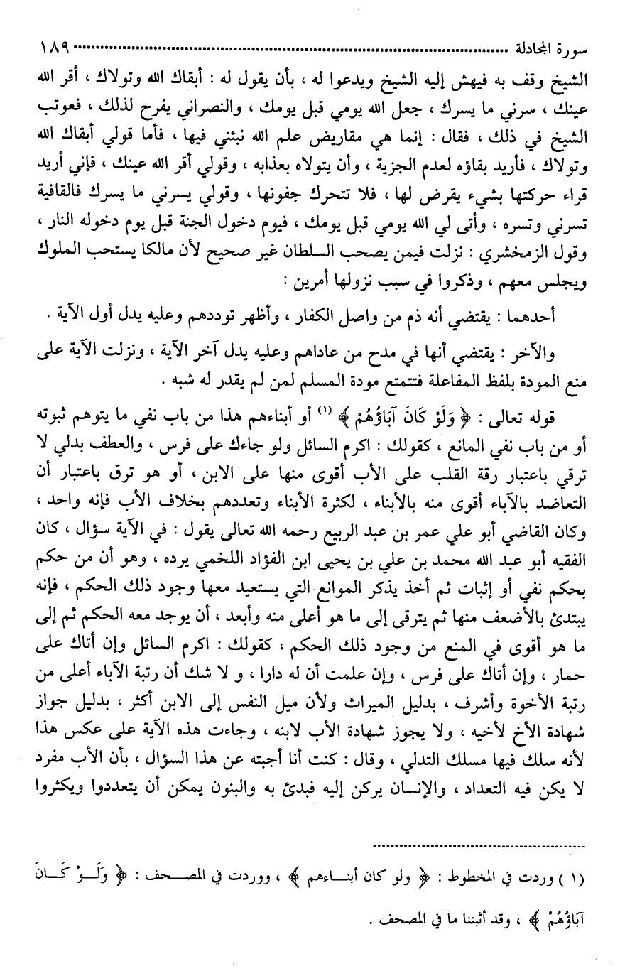 قوله تعالى: [(وَلَوْ كَانُوا آبَاءَهُمْ أَوْ أَبْنَاءَهُمْ) *] هذا من باب نفي ما يتوهم ثبوته أو من باب نفي المانع، كقولك: أكرم السائل ولو جاءك على فرس، والعطف [تدلي*] لا ترقي باعتبار رقة القلب على الأب أقوى منها على الابن، أو هو ترق باعتبار أن التعاضد بالآباء أقوى منه بالأبناء، لكثرة الأبناء وتعددهم؛ بخلاف الأب فإنه واحد، وكان القاضي أبو علي عمر بن عبد [الرفيع*] رحمه الله تعالى يقول: في الآية سؤال، كان الفقيه أبو عبد الله محمد بن علي بن يحيى ابن الفؤاد اللخمي يرده، وهو أن من حكم بحكم نفي أو إثبات ثم أخذ يذكر الموانع التي يستعيد معها وجود ذلك الحكم، فإنه يبتدئ بالأضعف منها ثم يترقى إلى ما هو أعلى منه وأبعد، أن يوجد معه الحكم ثم إلى ما هو أقوى في المنع من وجود ذلك الحكم، كقولك: أكرم السائل وإن أتاك على حمار، وإن أتاك على فرس، وإن علمت أن له دارا، ولَا شك أن رتبة الآباء أعلى من رتبة الأخوة وأشرف، بدليل الميراث ولأن ميل النفس إلى الابن أكثر، بدليل جواز شهادة الأخ لأخيه، ولا يجوز شهادة الأب لابنه، وجاءت هذه الآية على عكس هذا؛ لأنه سلك فيها مسلك التدلي، وقال: كنت أنا أجبته عن هذا السؤال، بأن الأب مفرد لا [يمكن*] فيه التعداد، والإنسان يركن إليه فبدئ به، والبنون يمكن أن يتعددوا ويكثروا